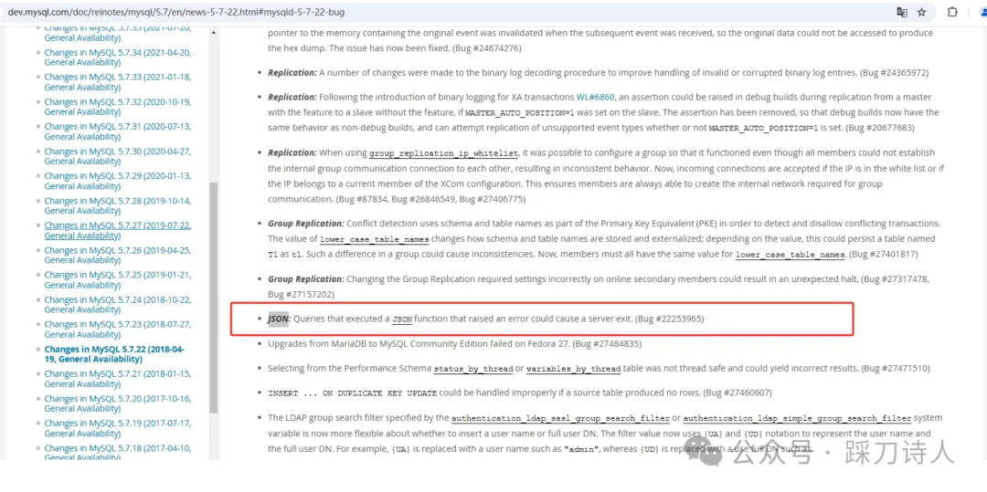 我就不卖关子了,是因为其他环境的MySQL版本较高,这个环境使用的是5.7.20版本,我在翻看MySQL更新日志的时候发现5.7.22中确实提到修复了老版本的一个JSON函数导致MySQL退出的bug