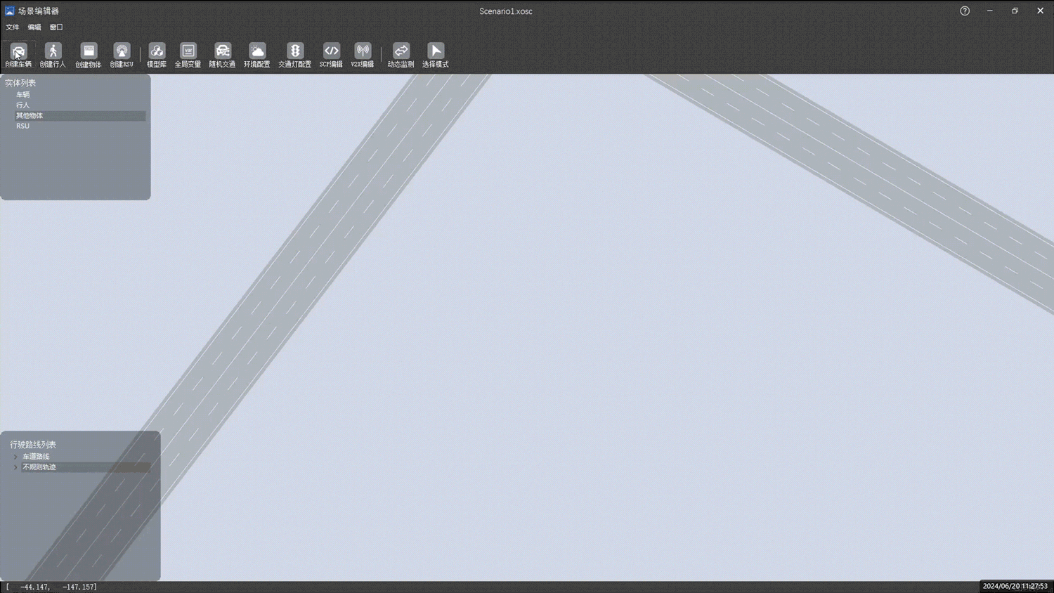 - 编辑:囊括了工具栏中的场景编辑工具,可在交通场景编辑过程中进行使用