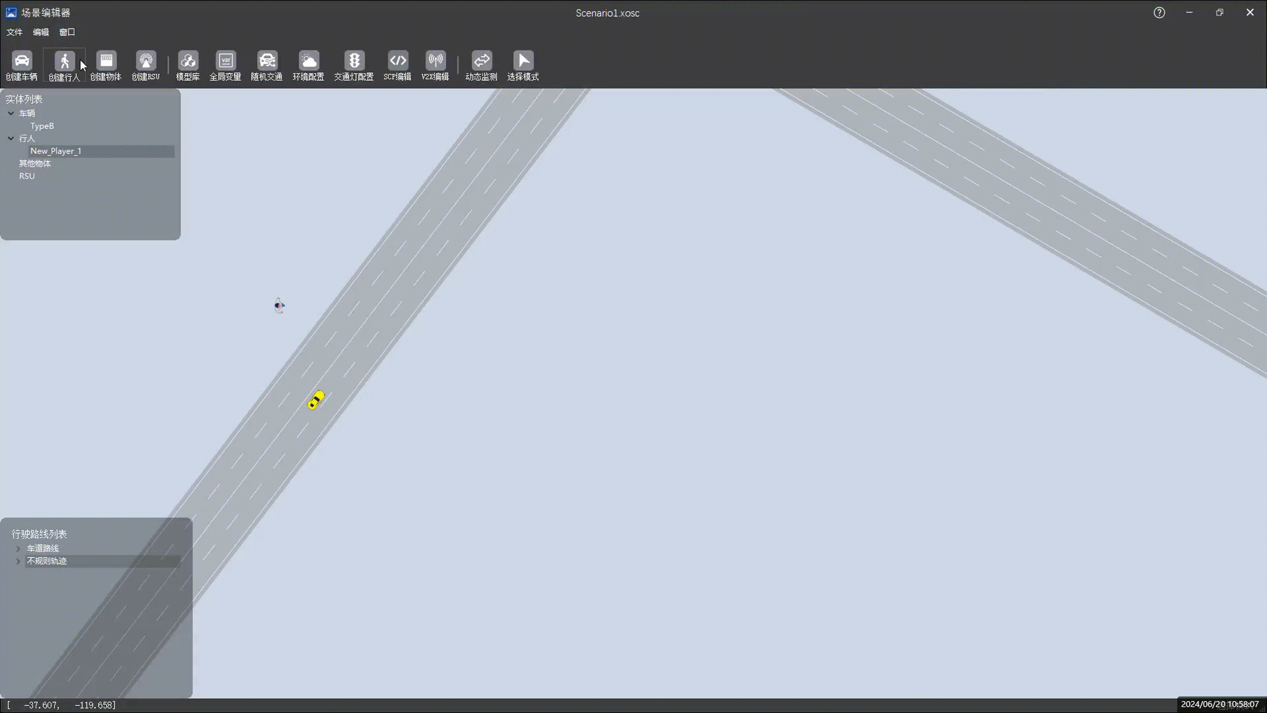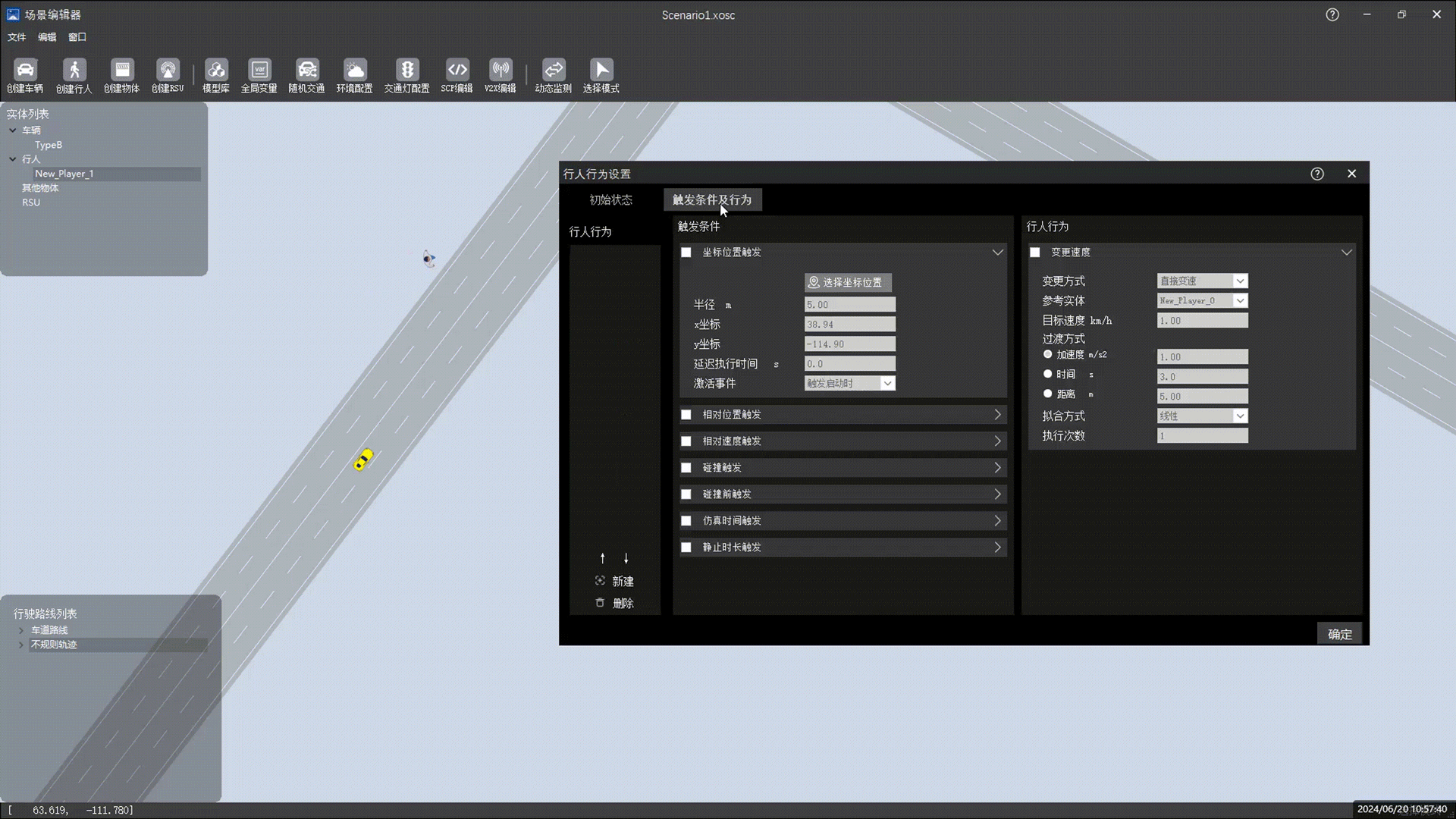 进入行人模式,点击后的鼠标光标在编辑器内将变为人形图标,通过在道路中或路旁再次点击来进行放置,从而实现对一个行人实体的初步创建。创建完成后,界面中将自动弹出“行人行为设置”对话框,可对行人的位置、外观模型和初速度信息和行驶路线等初始状态进行预设,并以“触发条件+行人行为”组合的形式对不同触发条件下行人的行为变化情况进行预设。例如,可实现定义行人行走的不规则轨迹,然后将触发条件设置为相对于车辆位置进行触发,随后令其行走速度由无到有进行变更,由此可实现行人横穿道路这一交通场景的搭建。