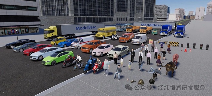 通过对车辆、行人和物体模型进行选择,ModelBase支持令这些实体在动画界面中呈现出不同的外观样式,如下图所示。
