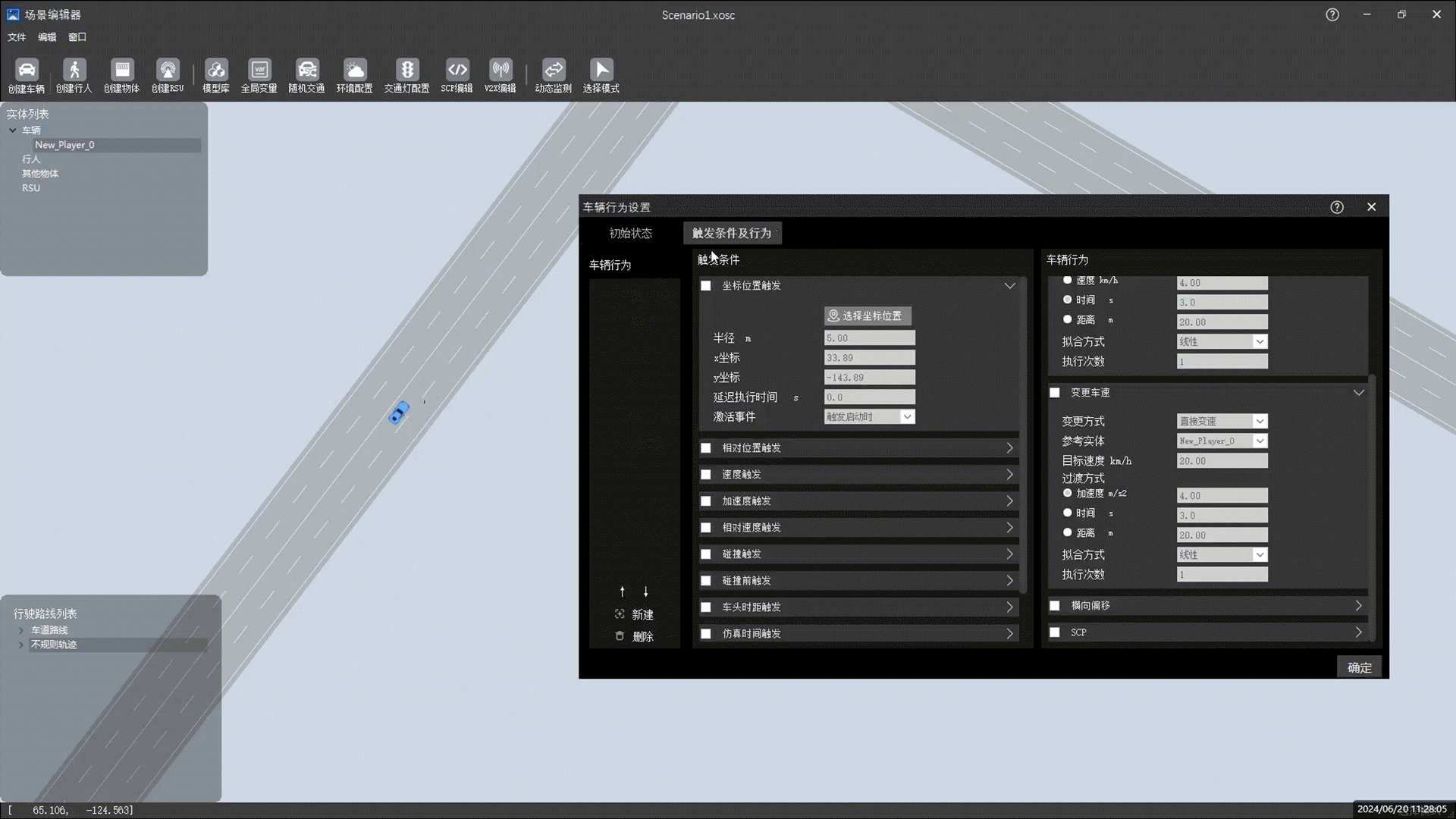 ③ 在触发条件及行为子界面中,可在车辆行为列表中创建一个或多个event,然后可以测试需求,对event的触发条件进行定义,并选择车辆在此阶段发生的横纵向行为变化。另外,也可以通过SCP指令作为一种特殊的行为定义形式,实现对车辆行为或交通场景变化的控制。