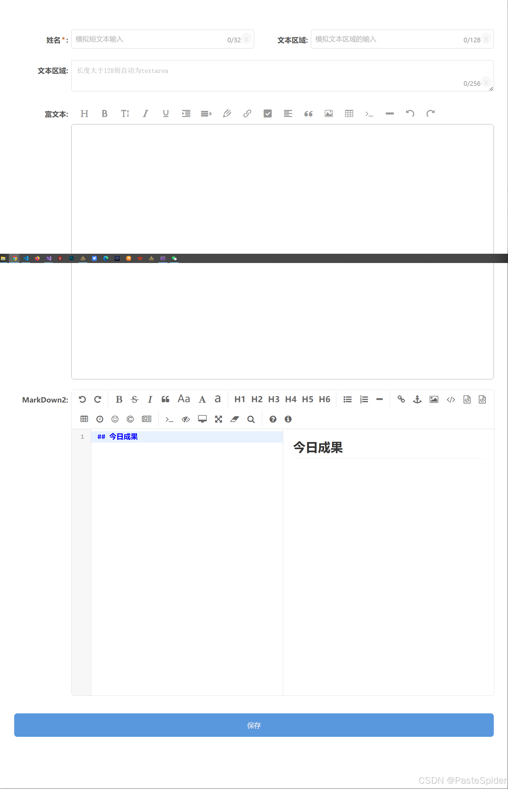 以上是我用双屏截图的,其实是一个完整的页面,注意看页面的表单中包含了text,textarea,richtext,markdown