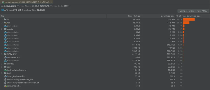 (1)读者想进行体积优化之前,需先分析下 APK 的各个模块占比,主要针对占比高的部分进行优化,比如:游戏中心中 lib、res、assets、resources 占比较高,就针对性的进行了优化;