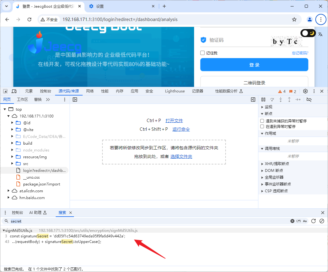 打开开发者工具,全局搜索secret,可以看到签名密钥