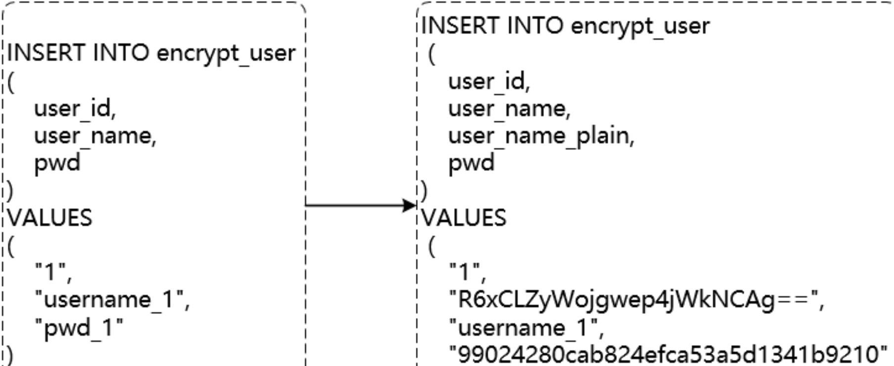 可将第一种情况看作第二种情况的特例。即第一种情况无明文列,仅密文列。ShardingSphere基于俩情况进行抽象: