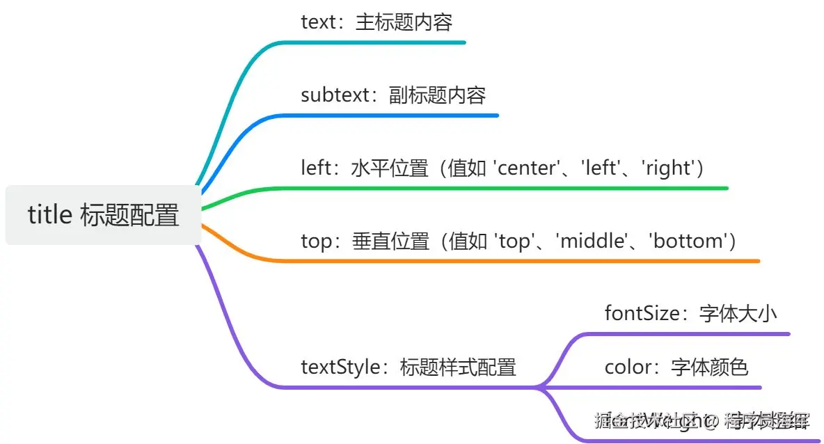 - textStyle*** **– 控制标题文本样式的对象,可以包括** ****color****,fontStyle,fontWeight,fontFamily,*fontSize****** ****等