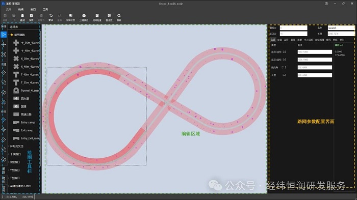 在选中编辑区域内的Road、Signal和Object等元素,可通过拖拽形式对其位置进行移动,或结合右侧的路网参数配置窗口以参数输入形式对元素的位置和角度进行调整。