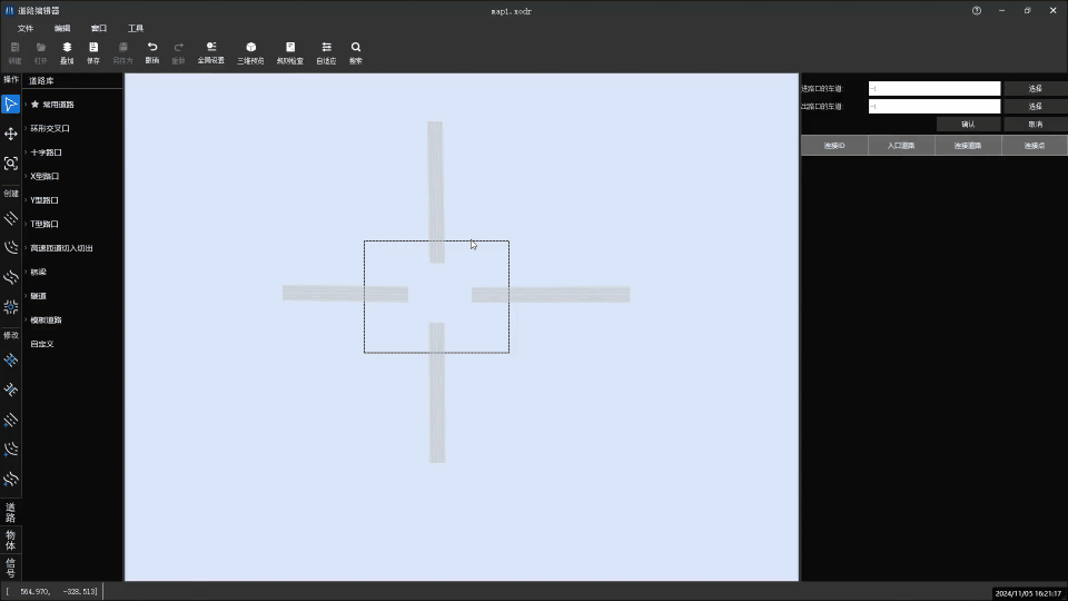 用于对编辑区域内的Road、Junction、Signal和Object等进行选中,然后用于在右侧的参数配置界面对这些元素进行详细的特征编辑,或是进行复制粘贴、删除等操作。