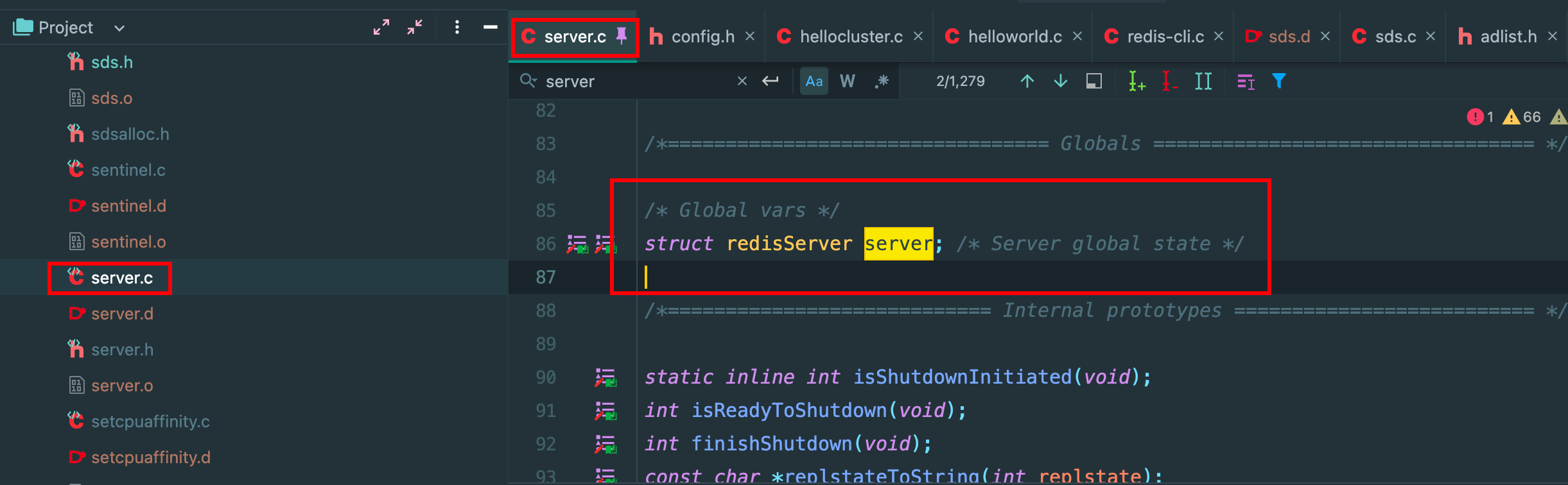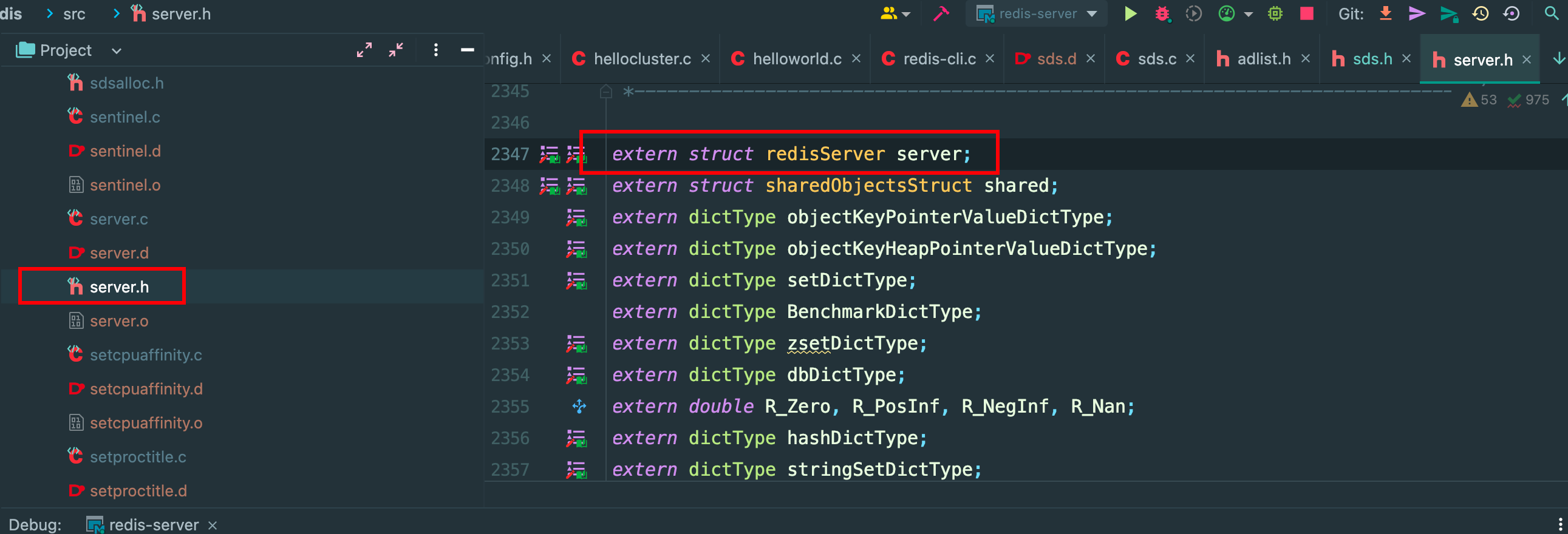 那其他的文件怎么使用?这个 sever 可是全局唯一的,维护了 redis 的全部状态数据,那当然是暴露出去,在哪里暴露出去,在 .h 文件,使用关键字 extern