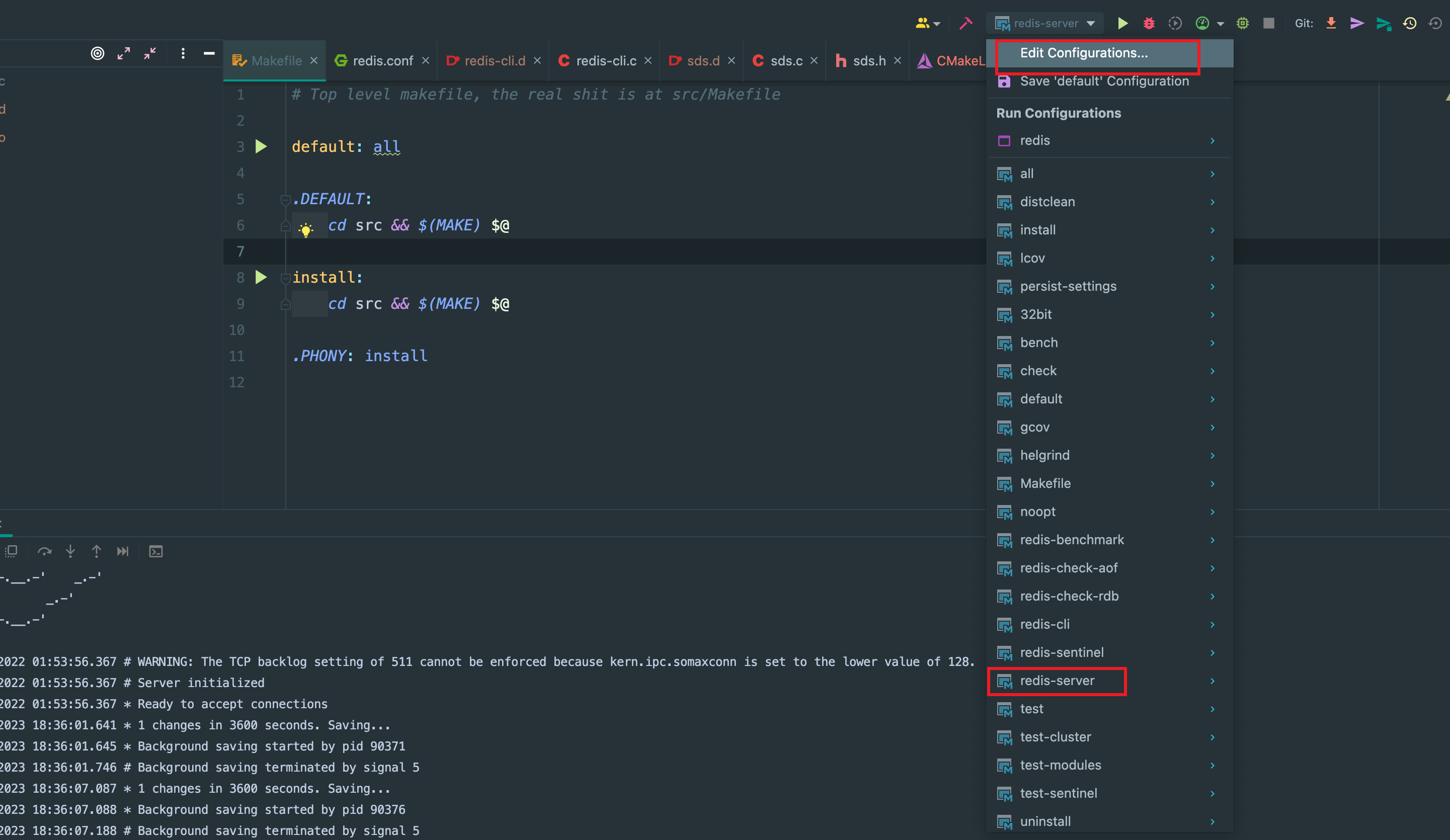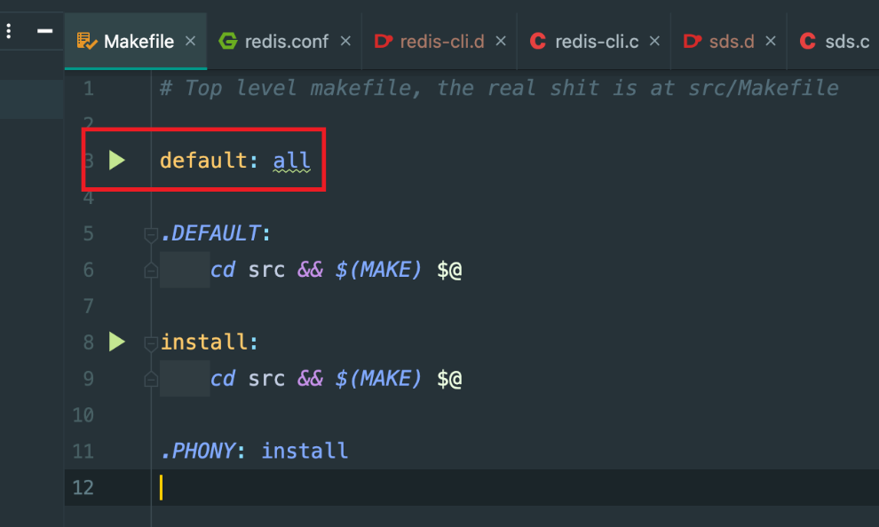 Clion 导入项目的时候选择已有的 MakeFile 文件,如果有是否 clean 项目,选择 clean 即可,之后可以点开 MakeFile 文件: