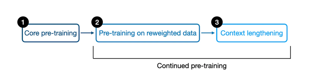持续预训练阶段包括了一个从4096个标记到8192个标记的小幅上下文延长步骤,使用的数据集包含1万亿个标记(核心预训练集是其五倍大)。然而,主要关注点是使用高质量数据混合进行训练,特别强调数学和编码。