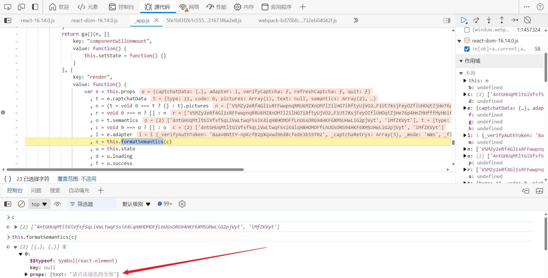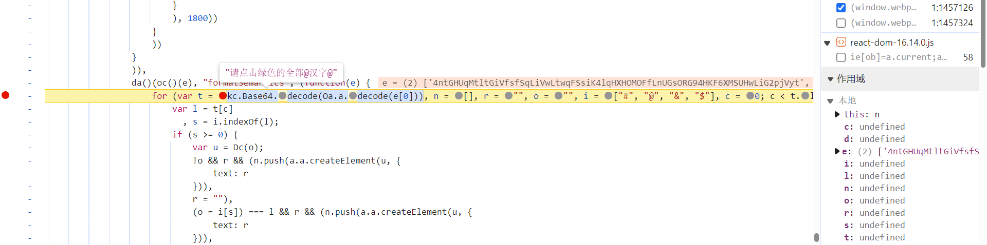 单步调试,分析,寻找解密点。向上跟栈到此处,可以看到,c 就是经过加密后的标题,经过 this.formatSemantics