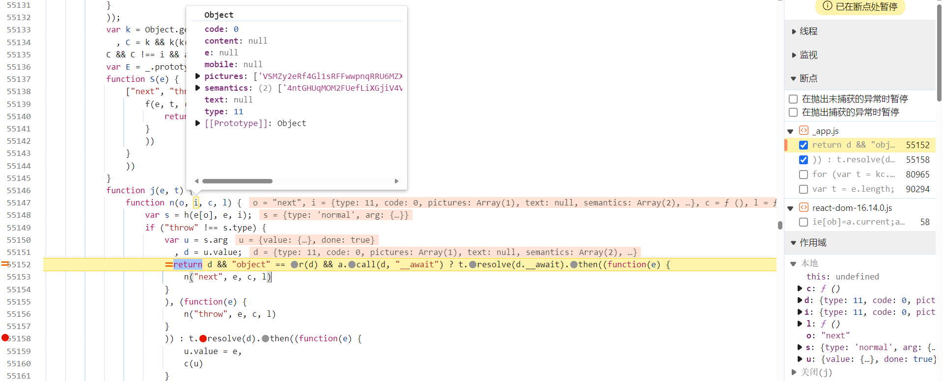 文件中,是异步的,关于异步跟栈的分析流程,之前的文章写过很多,就不再赘述了。跟栈进去,在下图 return 处下个条件断点 i.pictures