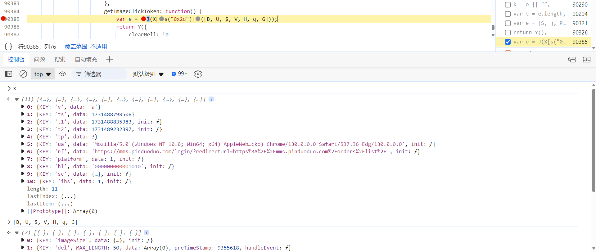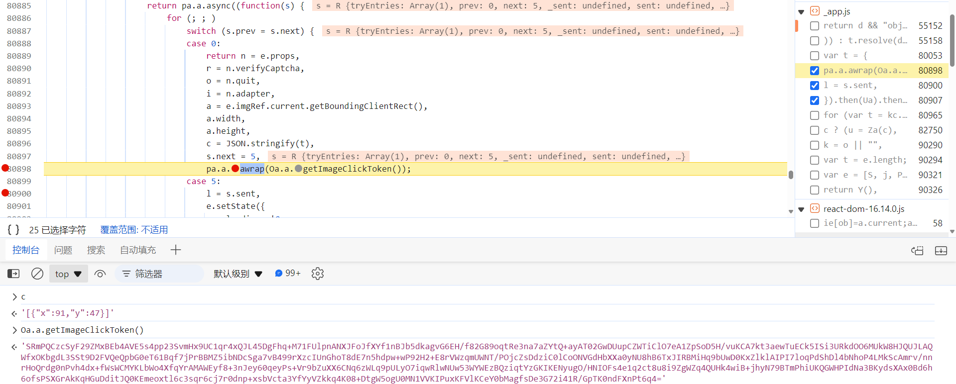 文件中局部搜索定位,逐个下断分析。定位到下图处,c 就是点击的坐标,Oa.a.getImageClickToken()