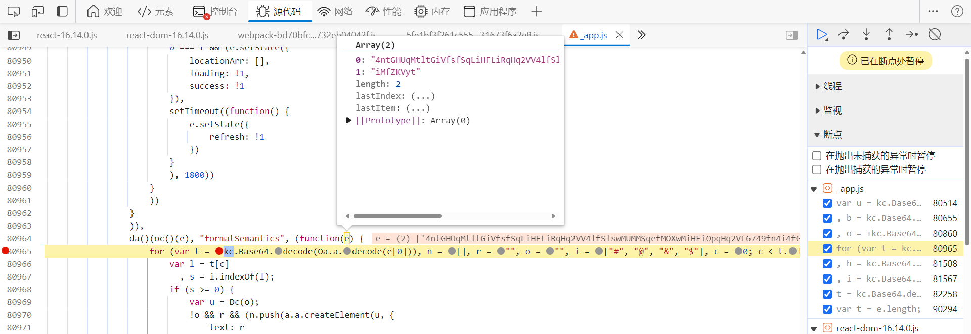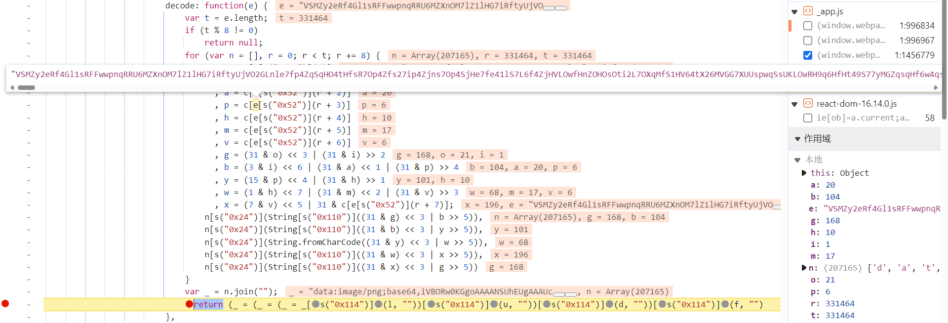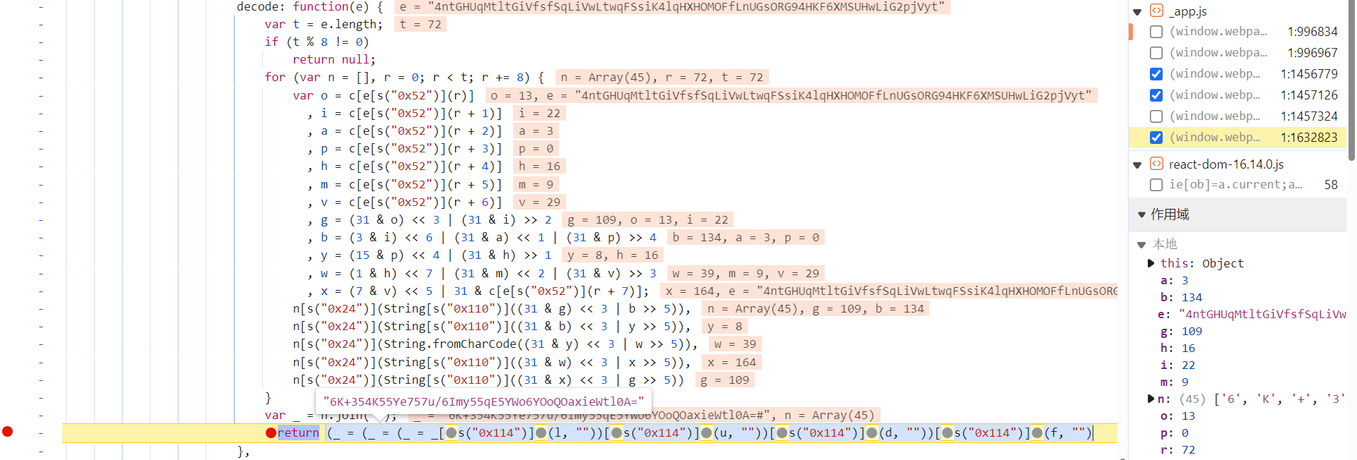 第二种,直接搜索 decode,尝试定位解密算法的位置。跟栈进去后发现,_app.js
