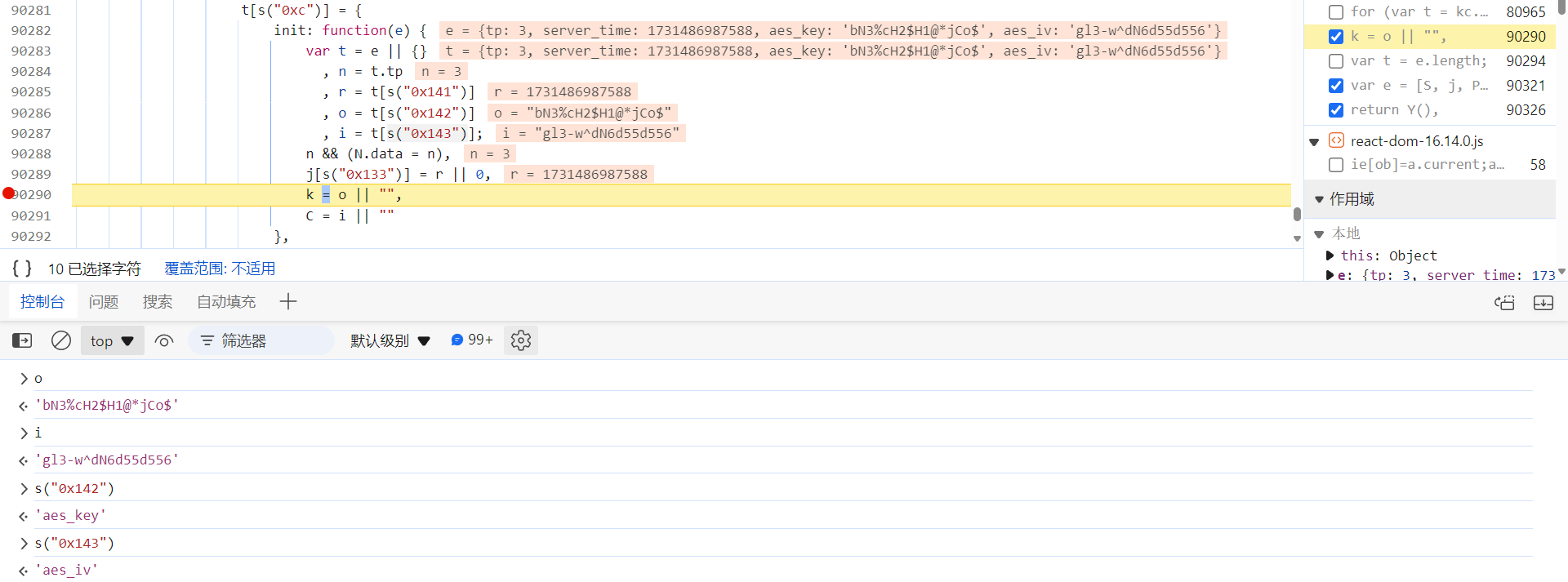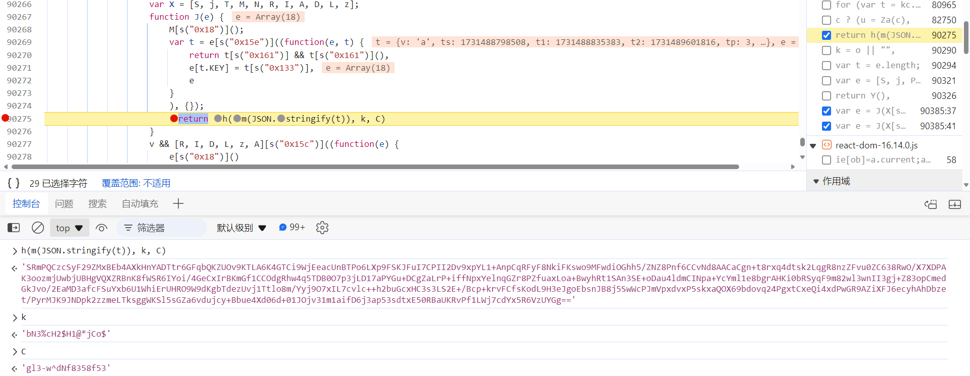 接下来,分析 h 函数,其就在 m 函数上面,跟过去下断点,key 和 iv 对应前文提到的 k 和 C: