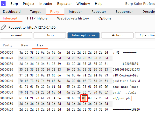 变成了POST请求,由于不在url中,所以%00不能用,用十六进制的00