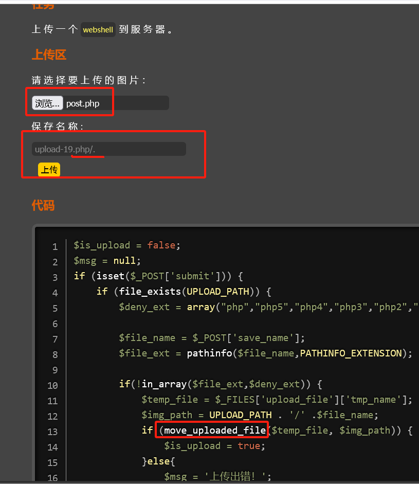 思路:利用move_uploaded_file()函数的漏洞,在文件名后面加上/.会自动忽略