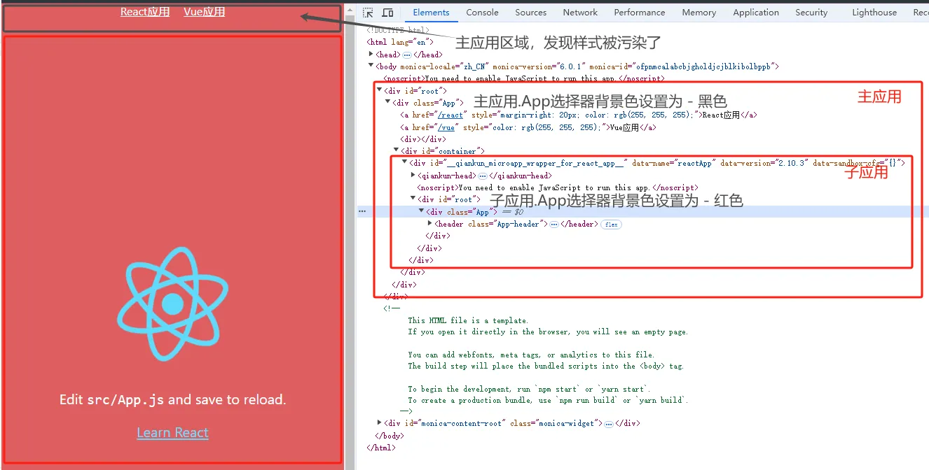 ok!我们创建了一个 qiankun 项目,现在主应用和子应用根节点类名相同,都是 .App,主应用根节点背景色设置为黑色,子应用根节点背景色设置为红色