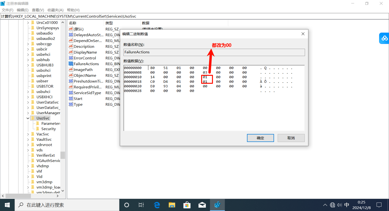 最后再找到FailureActions键并双击进行编辑,将00000010和00000018行中的第五个数值,由原来的01改为00【双击数字可改】,再单击确定。
