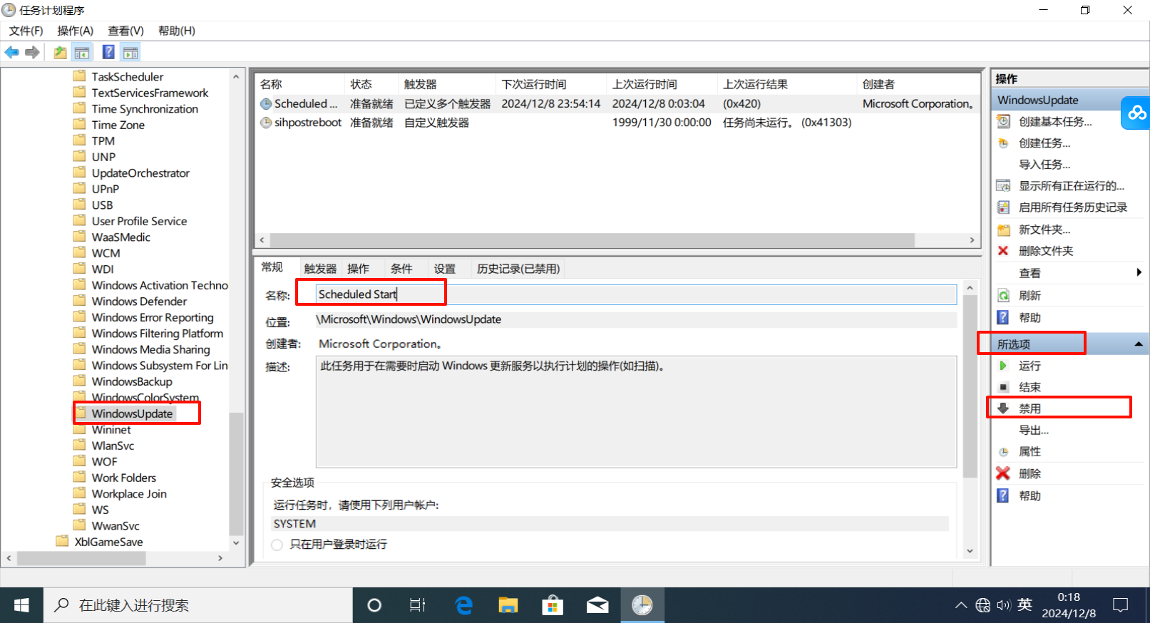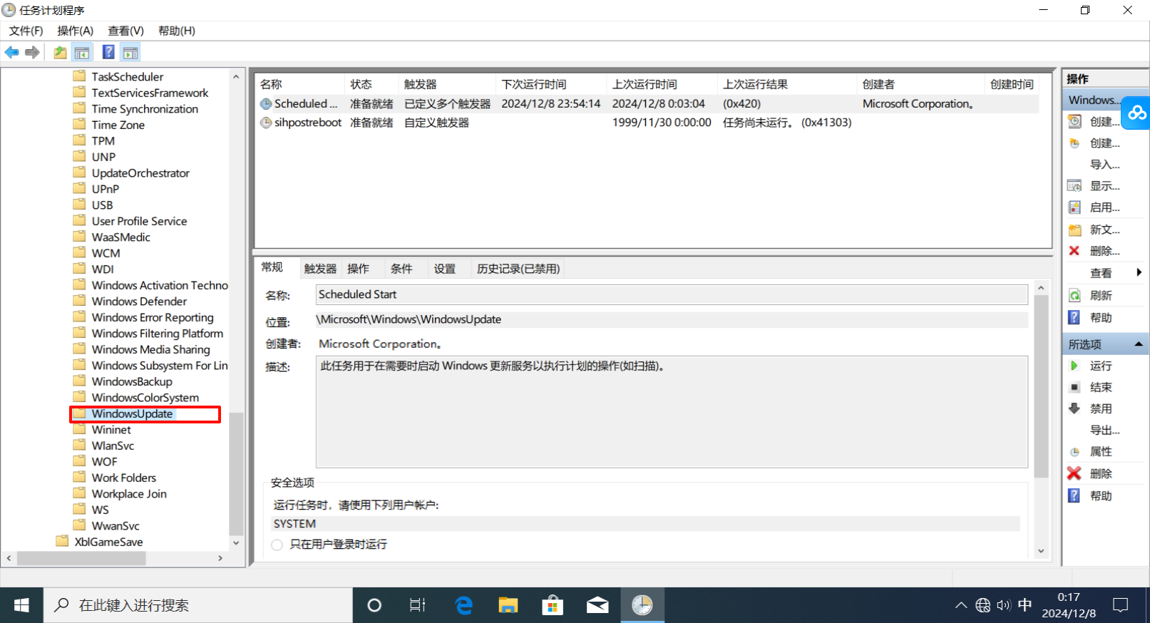 其次,在任务计划程序窗口中,跳转到该路径任务计划程序库/Microsoft/Windows/WindowsUpdate,即以下界面