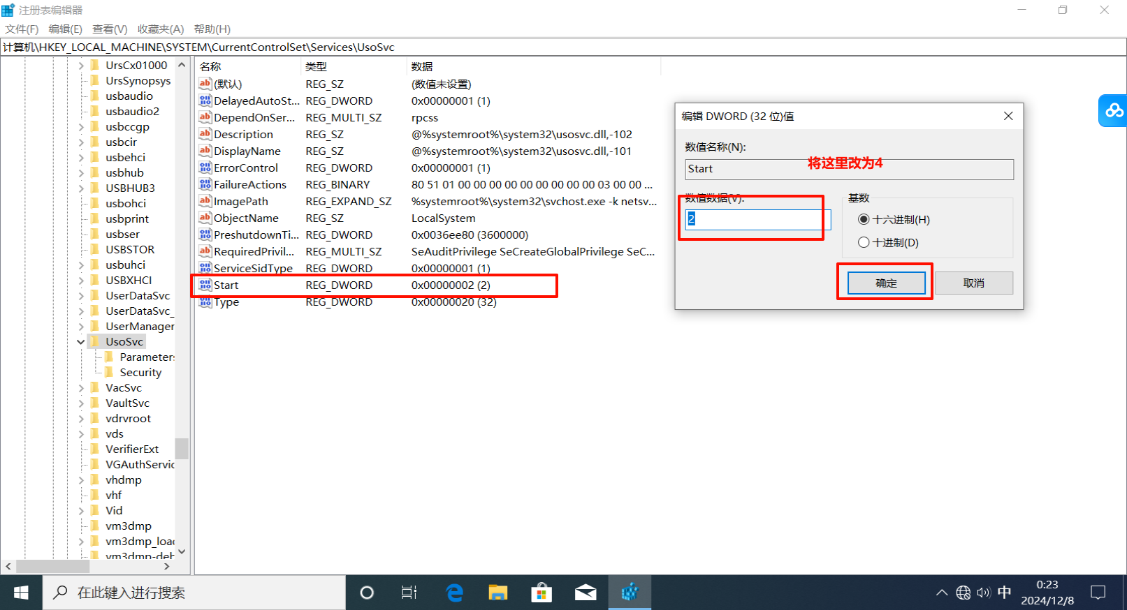 右侧找到Start键并双击打开它,并将数值数据改为4,并单击确定