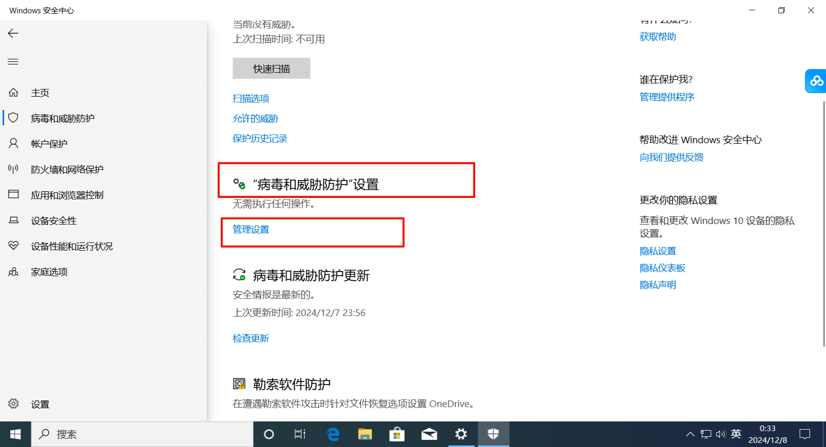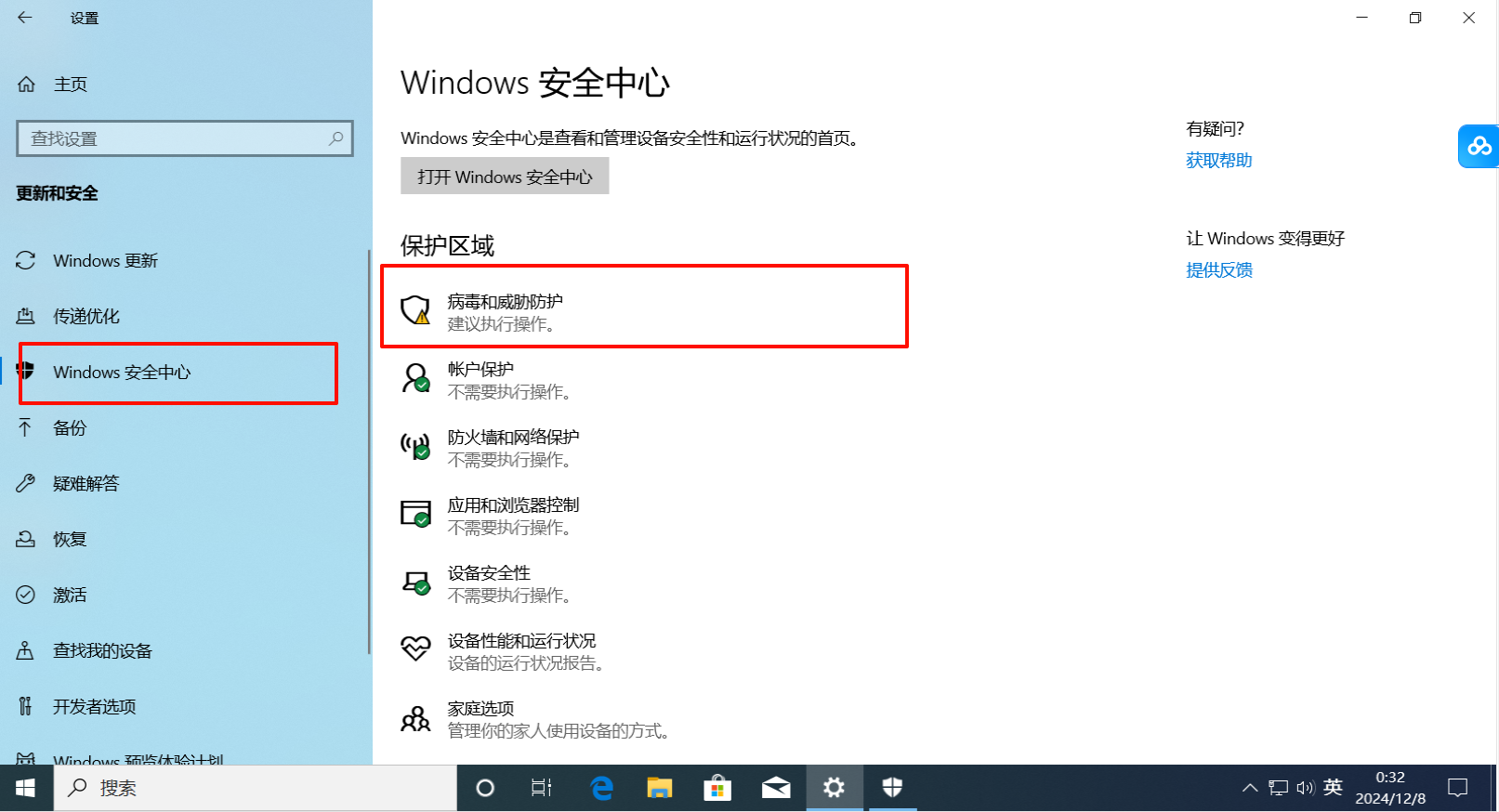 打开设置 > windows安全中心 > 病毒与威胁防护