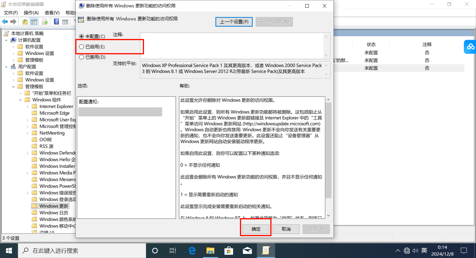 再配置第二个,依次单击用户配置> 管理模板 > Windows组件 > Windows更新,然后找到删除使用所有Windows更新功能的访问权限并双击打开它