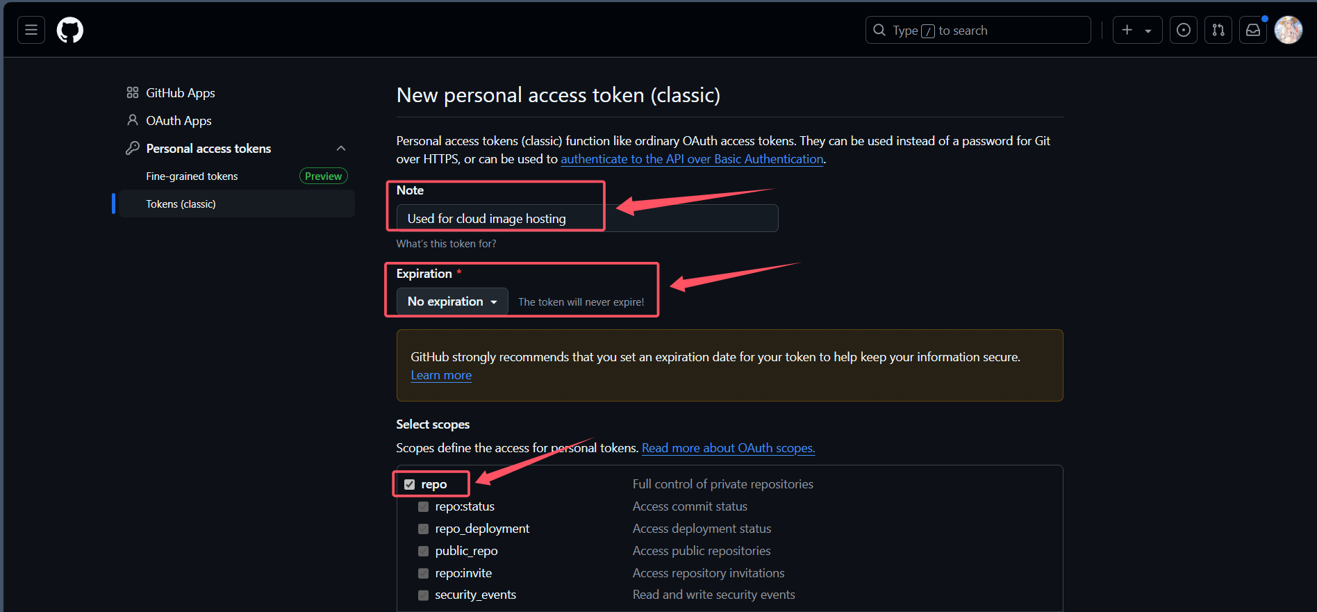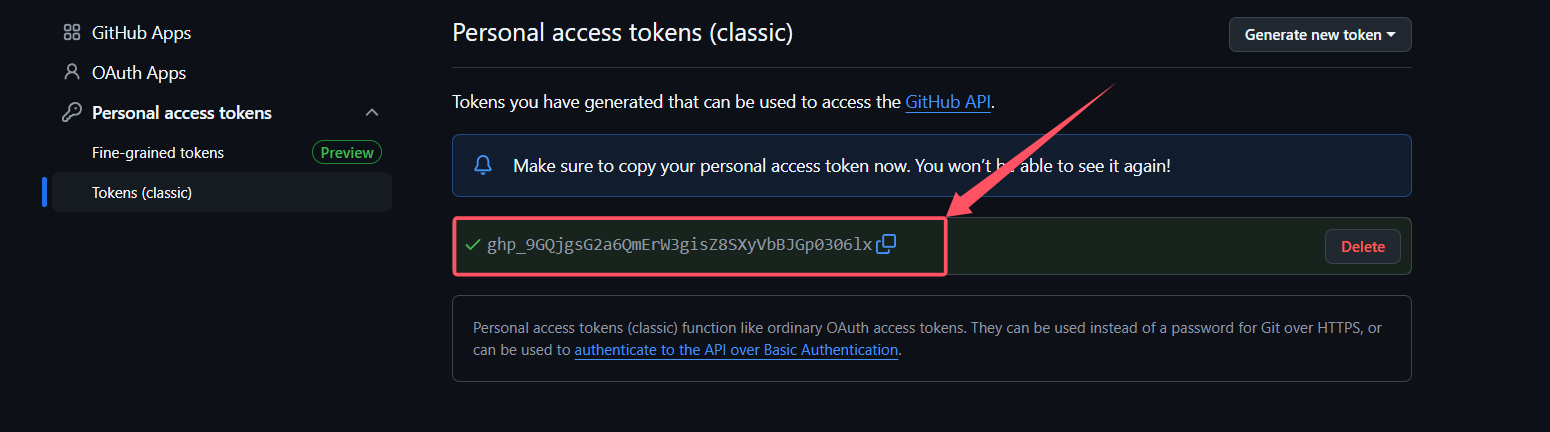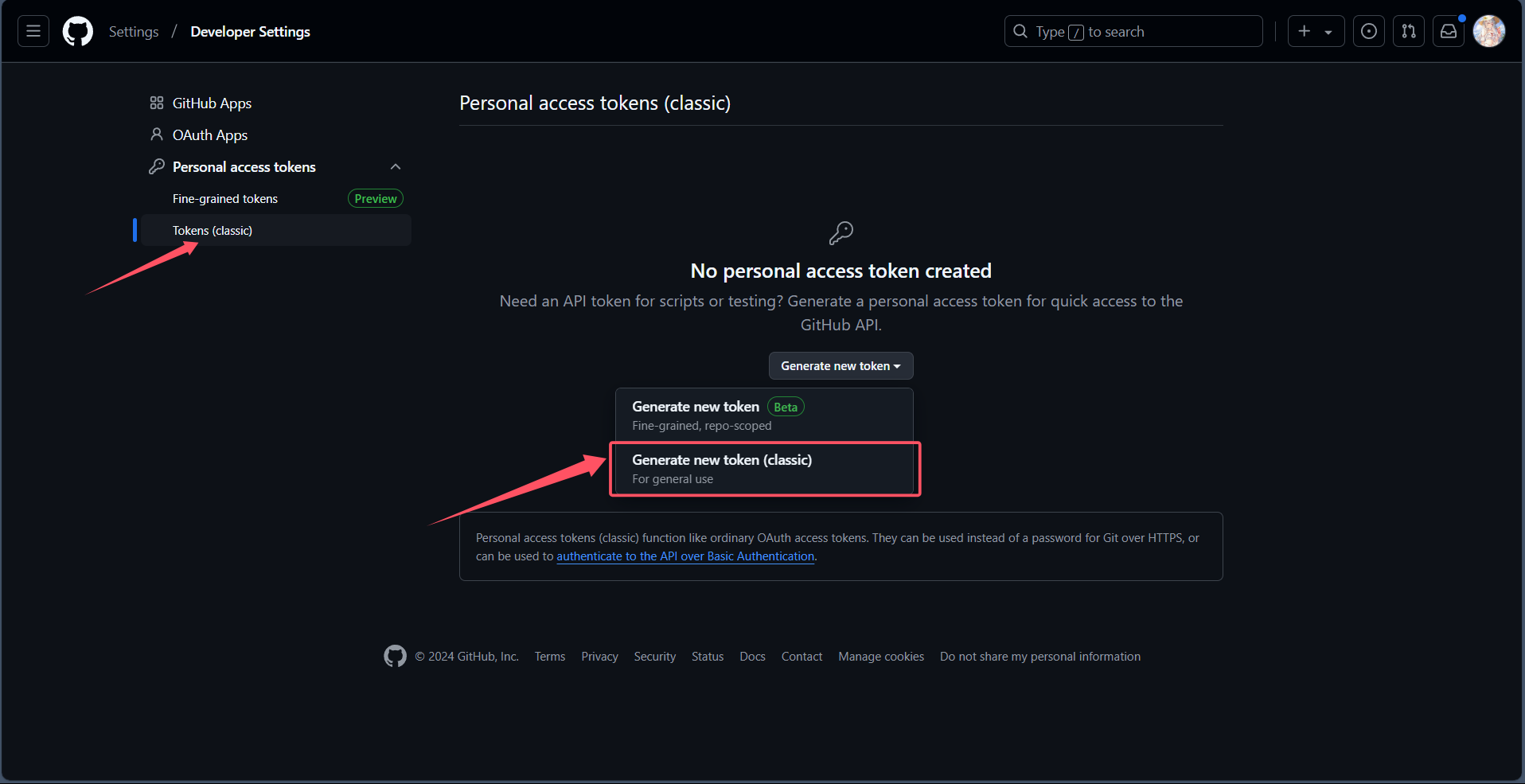 依此点击 Personal access tokens –> Tokens(classic) –> Generate new token –> Generate new token(classic)