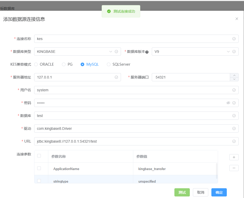 接下来,我们可以继续正常配置 KES 的链接信息。在配置过程中,请特别注意不要选择错误的 KES 兼容模式,否则可能会导致配置失败。具体效果请参见下图。