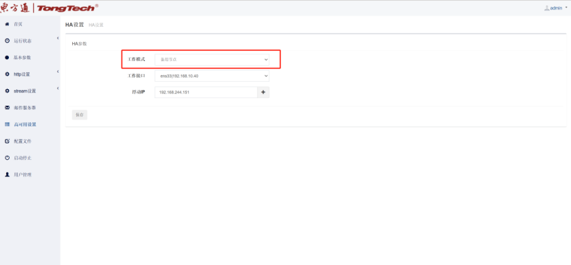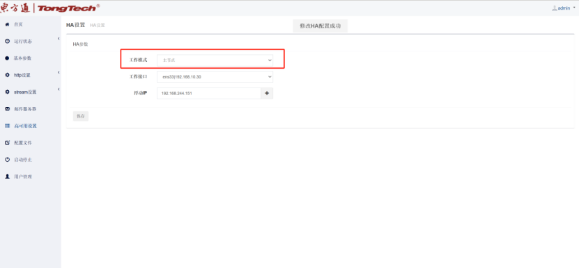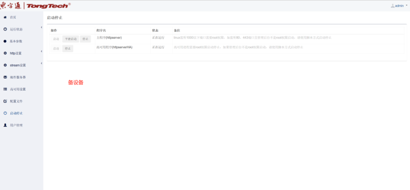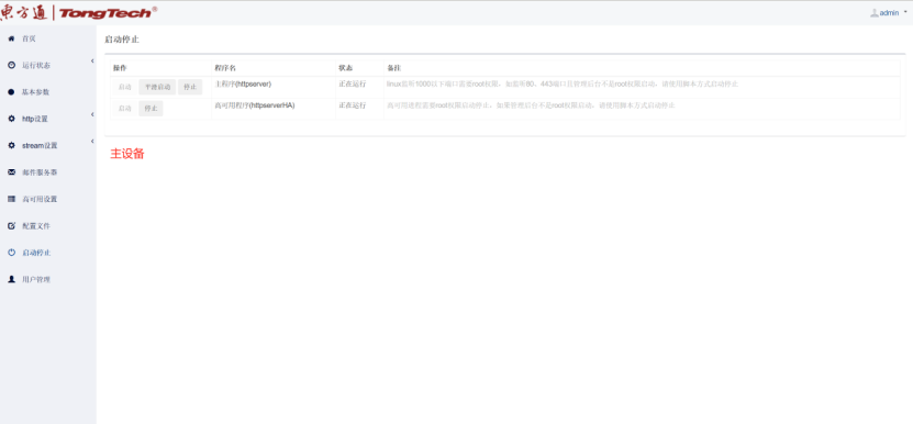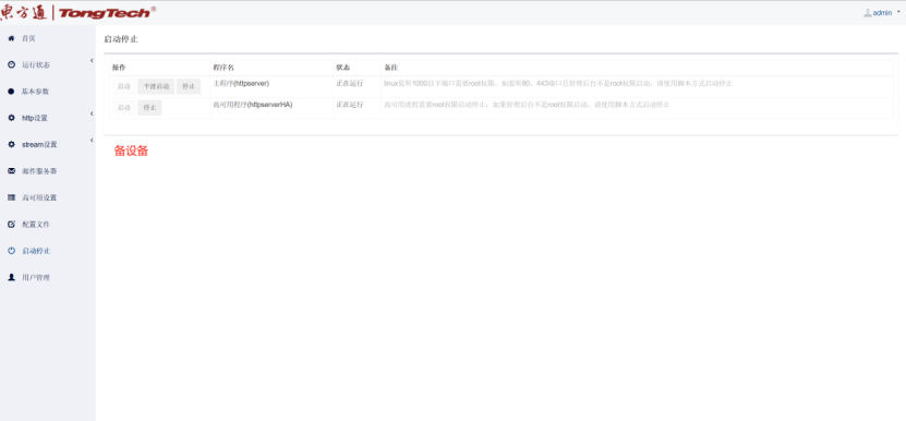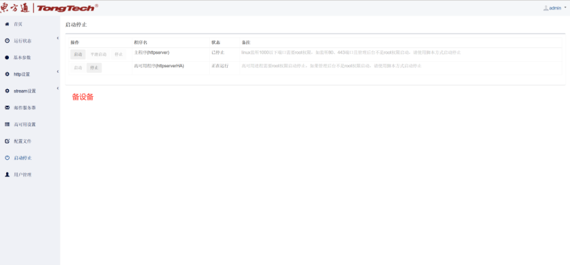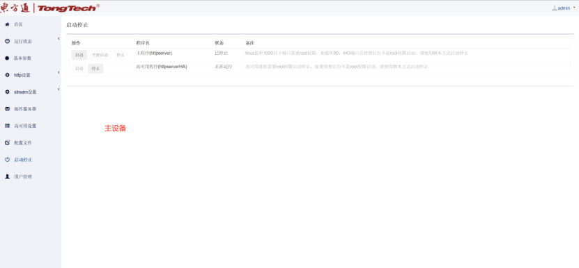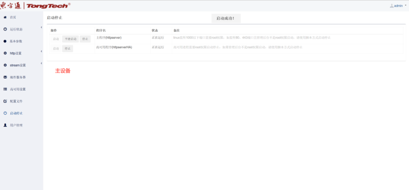 六、到“高可用配置”界面这里会自动获取本机网卡IP信息,然后在“启动停止”界面依次点击启动Httpserver服务和高可用服务;注:主备设备同样操作方式。