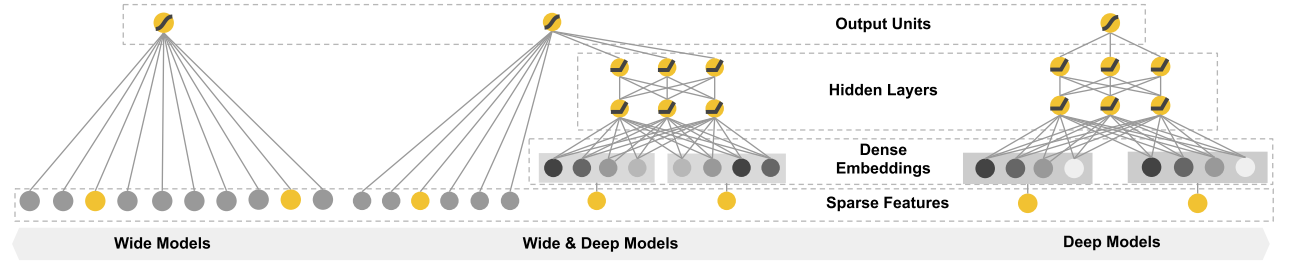 wide部分实现稀疏、高维特征的历史信息学习。本质上是一个逻辑回归模型。
