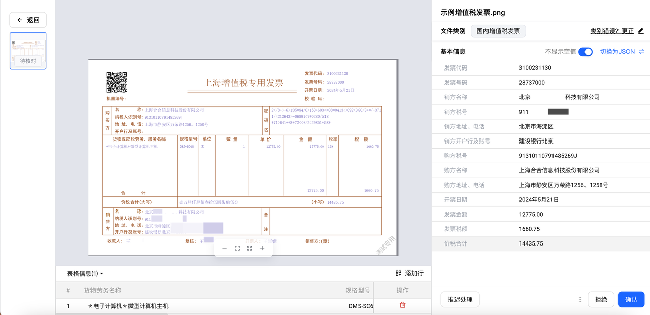 - 抽取定位显示:我们通过DocFlow工作空间直观展示票据字段抽取的形式,用户也可以自定义字段。
