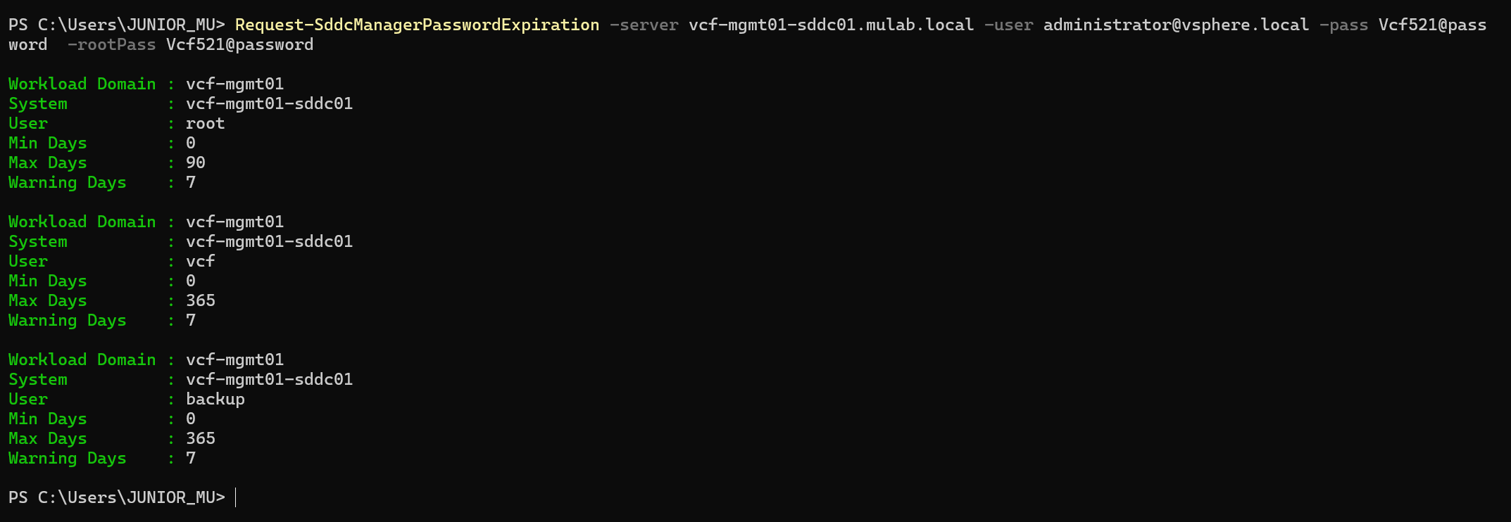 Request-SddcManagerPasswordExpiration -server vcf-mgmt01-sddc01.mulab.local -user administrator@vsphere.local -pass Vcf521@password -rootPass Vcf521@password