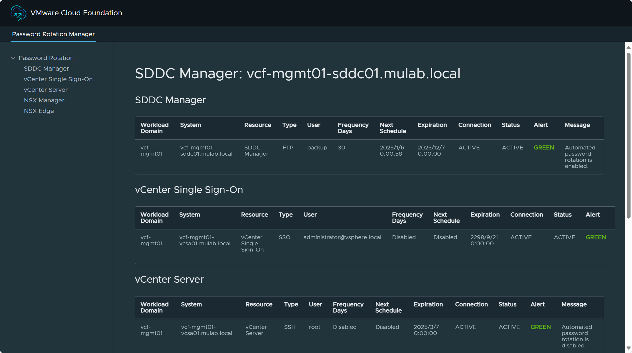 | 5 | NSX : vcf-mgmt01-nsx01.mulab.local | admin | Dec 07, 2024 | Mar 07, 2025 | 90 days | GREEN |