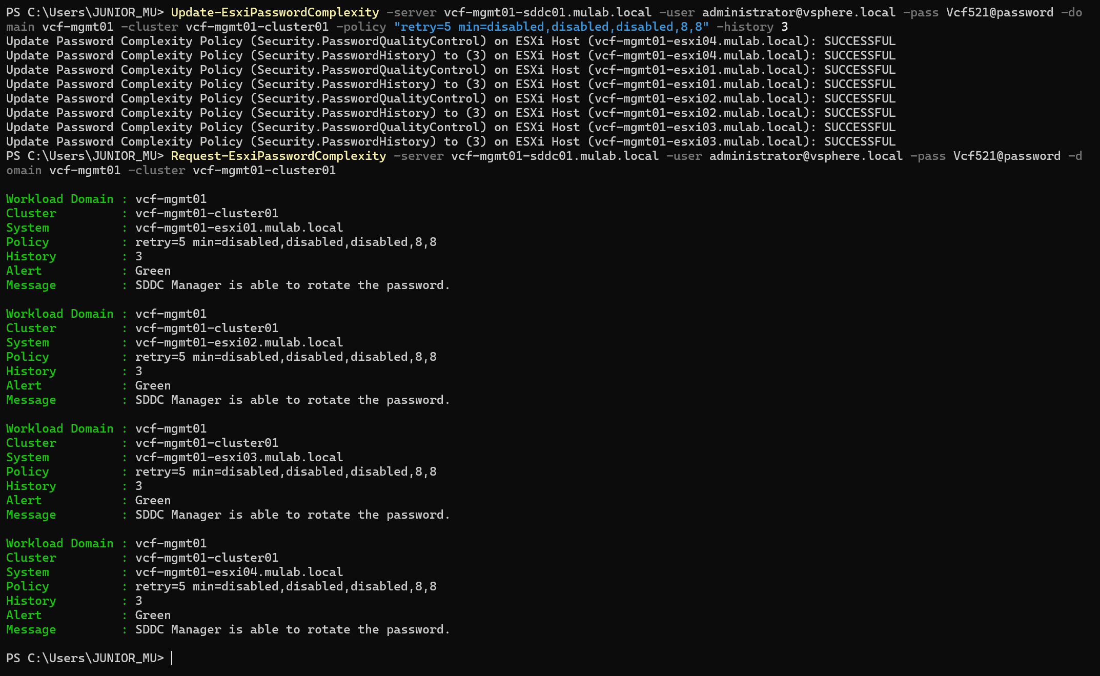 Update-EsxiPasswordComplexity -server vcf-mgmt01-sddc01.mulab.local -user administrator@vsphere.local -pass Vcf521@password -domain vcf-mgmt01 -cluster vcf-mgmt01-cluster01 -policy "retry=5 min=disabled,disabled,disabled,8,8" -history 3