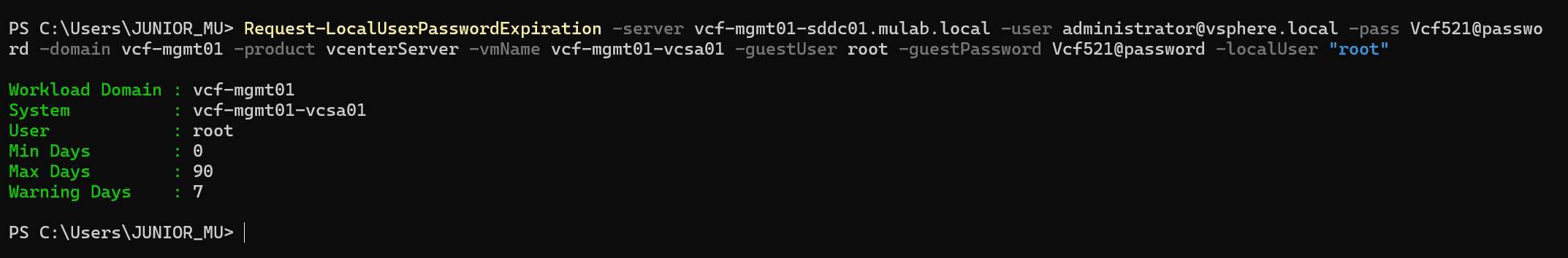 Request-LocalUserPasswordExpiration -server vcf-mgmt01-sddc01.mulab.local -user administrator@vsphere.local -pass Vcf521@password -domain vcf-mgmt01 -product vcenterServer -vmName vcf-mgmt01-vcsa01 -guestUser root -guestPassword Vcf521@password -localUser "root"
