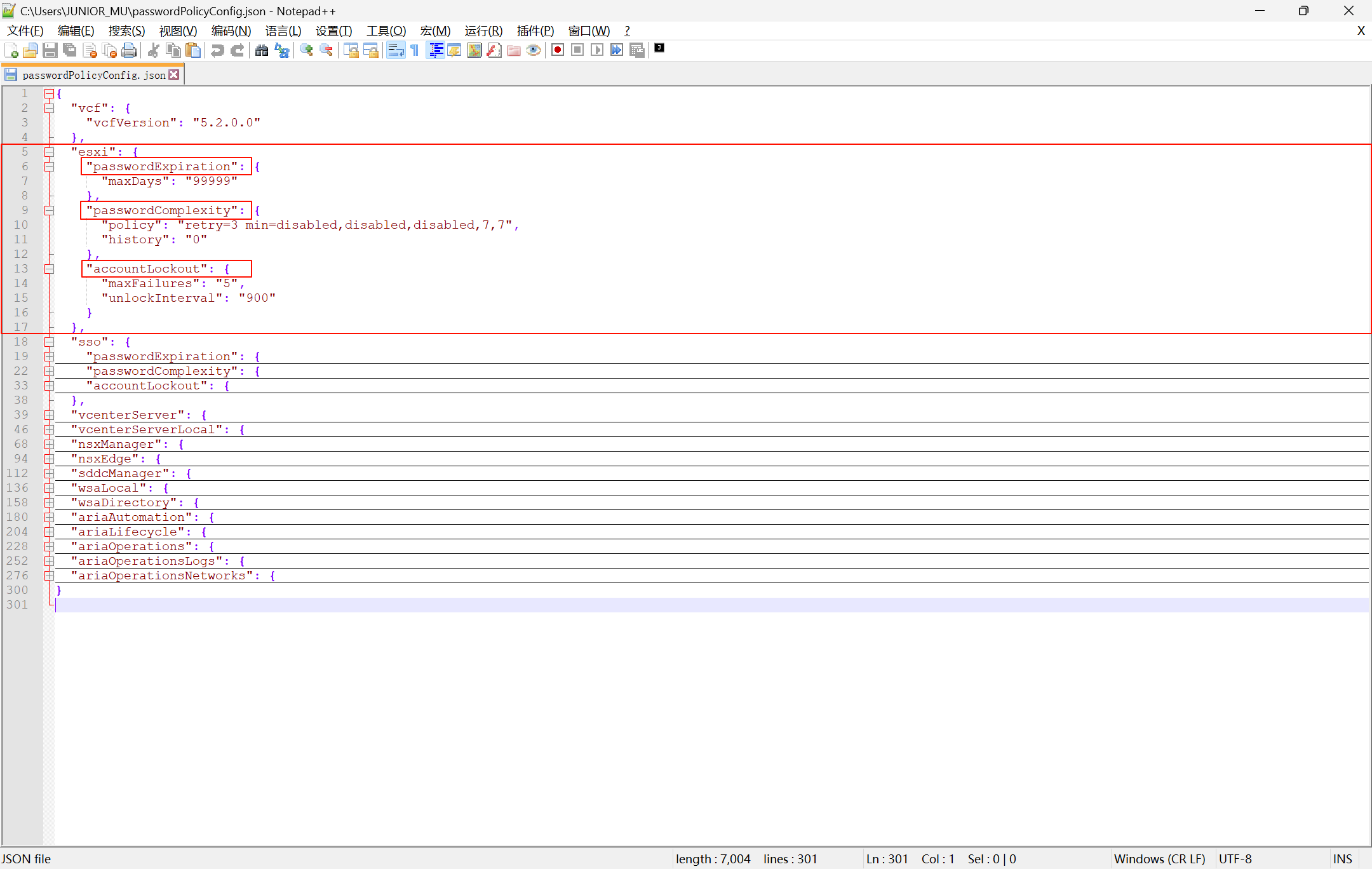 根据 JSON 文件以及报告文件,对 VCF 环境中的所有组件统一配置密码策略。