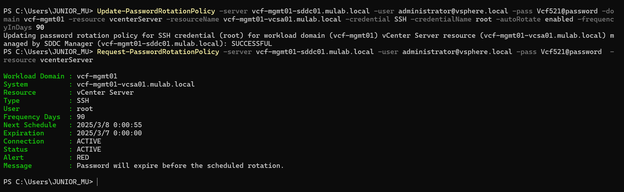 Update-PasswordRotationPolicy -server vcf-mgmt01-sddc01.mulab.local -user administrator@vsphere.local -pass Vcf521@password -domain vcf-mgmt01 -resource vcenterServer -resourceName vcf-mgmt01-vcsa01.mulab.local -credential SSH -credentialName root -autoRotate enabled -frequencyInDays 90