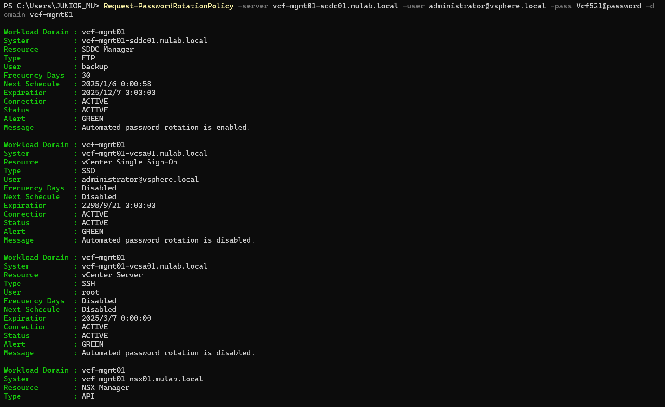 Request-PasswordRotationPolicy -server vcf-mgmt01-sddc01.mulab.local -user administrator@vsphere.local -pass Vcf521@password