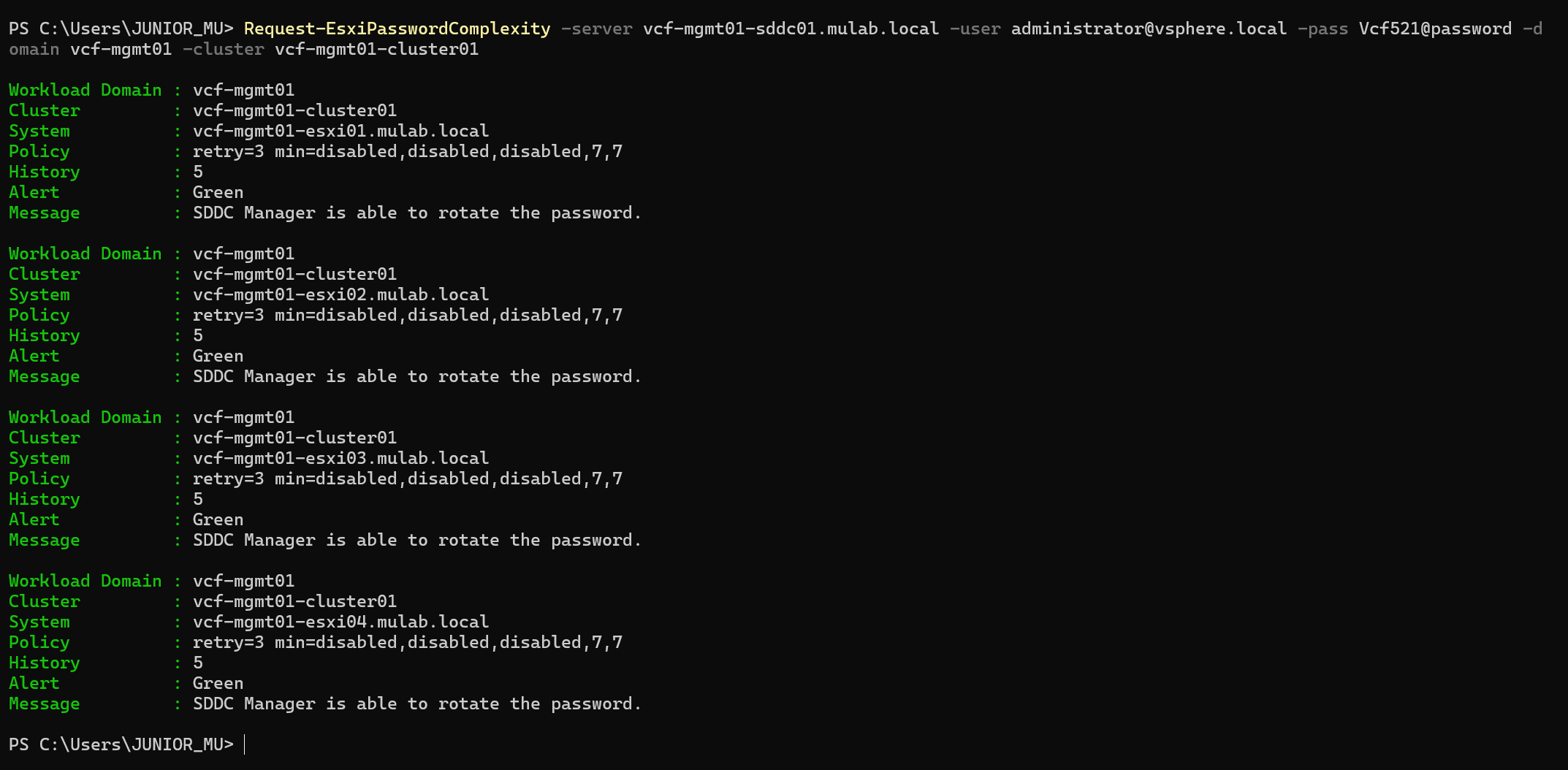Request-EsxiPasswordComplexity -server vcf-mgmt01-sddc01.mulab.local -user administrator@vsphere.local -pass Vcf521@password -domain vcf-mgmt01 -cluster vcf-mgmt01-cluster01