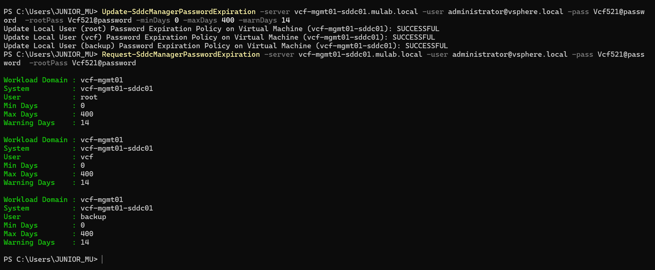Update-SddcManagerPasswordExpiration -server vcf-mgmt01-sddc01.mulab.local -user administrator@vsphere.local -pass Vcf521@password -rootPass Vcf521@password -minDays 0 -maxDays 400 -warnDays 14
