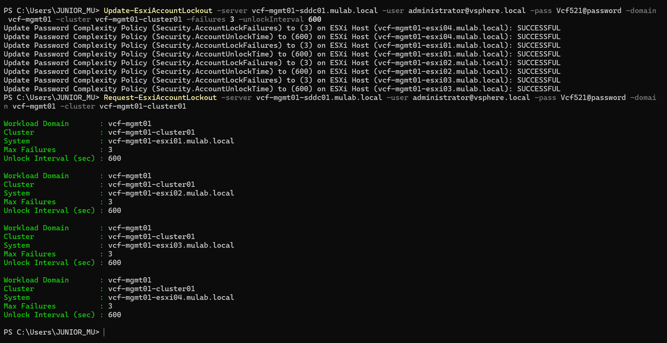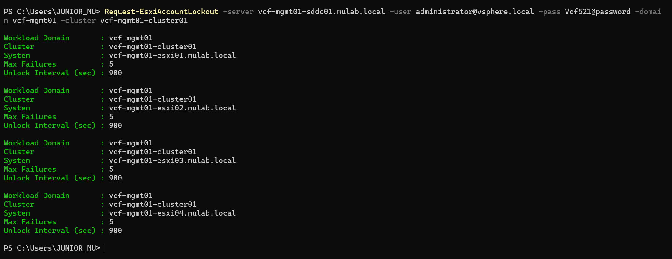 Request-EsxiAccountLockout -server vcf-mgmt01-sddc01.mulab.local -user administrator@vsphere.local -pass Vcf521@password -domain vcf-mgmt01 -cluster vcf-mgmt01-cluster01