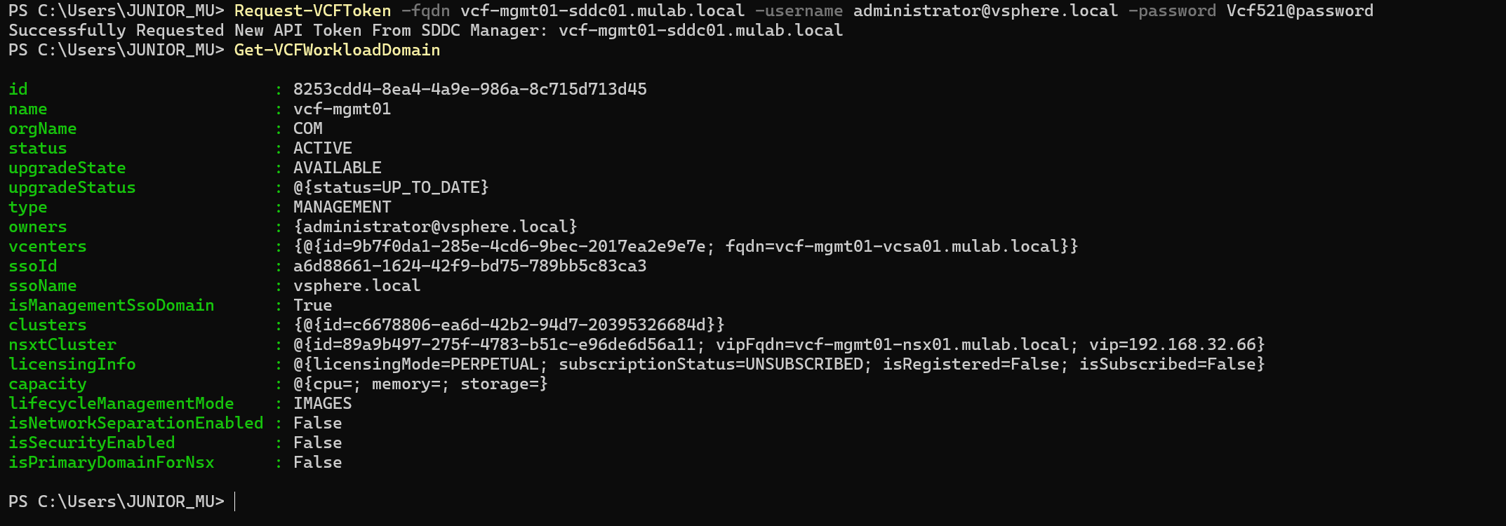 Request-VCFToken -fqdn vcf-mgmt01-sddc01.mulab.local -username administrator@vsphere.local -password Vcf521@password