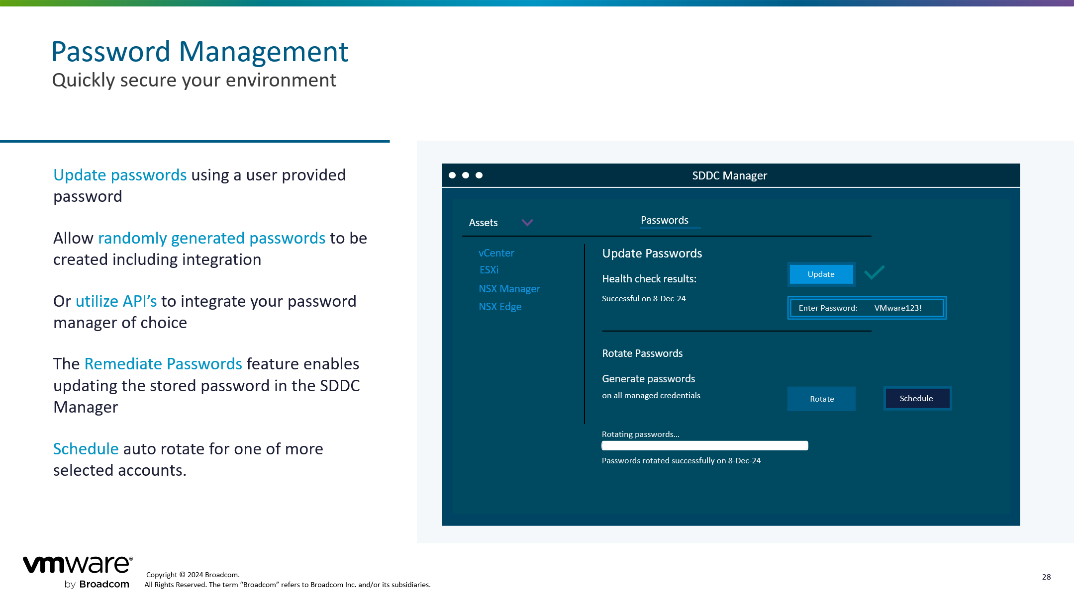 使用 SDDC Manager 中的“密码管理”功能可以统一管理 VCF 环境中组件的用户密码,比如更新(Update)、轮换(Rotate)以及修复(Remediate)组件的密码等,您还可以创建密码轮换调度任务,以防止因遗忘或其他原因导致密码过期及组件中断,进而影响业务。