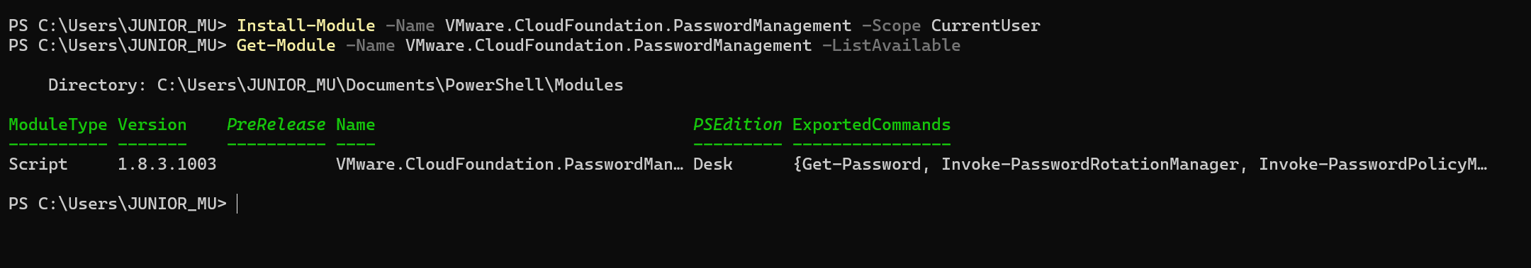 Install-Module -Name VMware.CloudFoundation.PasswordManagement -Scope CurrentUser