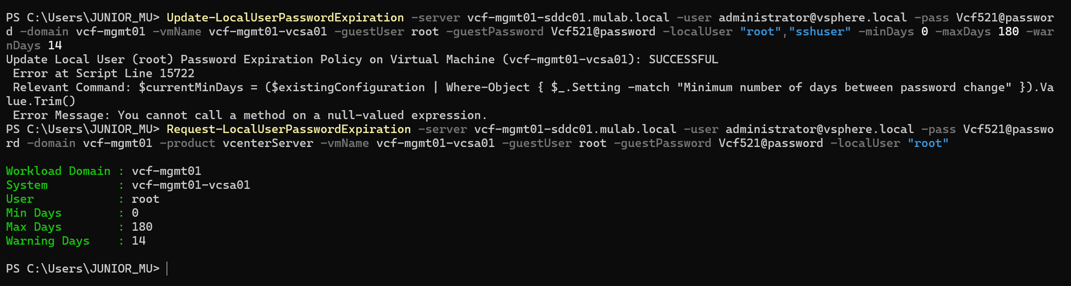 Update-LocalUserPasswordExpiration -server vcf-mgmt01-sddc01.mulab.local -user administrator@vsphere.local -pass Vcf521@password -domain vcf-mgmt01 -vmName vcf-mgmt01-vcsa01 -guestUser root -guestPassword Vcf521@password -localUser "root","sshuser" -minDays 0 -maxDays 180 -warnDays 14