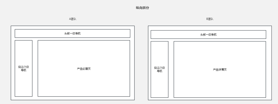 图中展示了两个页面,它们各自承担着不同的业务职责。我们可以看到,一个是产品详情页,另一个是产品创建页。尽管它们的业务功能不同,但它们的头部导航和侧边导航部分是共用的。这种由一个团队负责整个页面的设计和开发的方式,被称为纵向拆分。在这种情境下,如何合理地拆分业务,可以借助领域驱动设计(Domain-Driven Design, DDD)作为指导思想。 如果你经常写单页应用,纵向拆分其实要比横向拆分更容易理解,也更容易实施。 不知道大家还记不记得这样一句话,叫做前端在一定程度上是天然解耦的。什么意思呢?就是往往,我们在开发分配任务的时候,很少会说,你写一个搜索框,他写一个列表,然后最后组合在一起,而是你写这个页面,他写那个页面,最终在项目合并的时候也不会互相干扰和依赖。而这种场景以及拆分方式,其实更适合ToB的后台管理系统、SaaS类项目。 这样的项目往往业务领域明确,范围清晰,但是业务逻辑和场景则多变和复杂。通过纵向拆分可以聚合针对某一领域理解深刻的开发及产品团队,专注于单一领域,为整个项目的迭代和发展带来更大的优势。